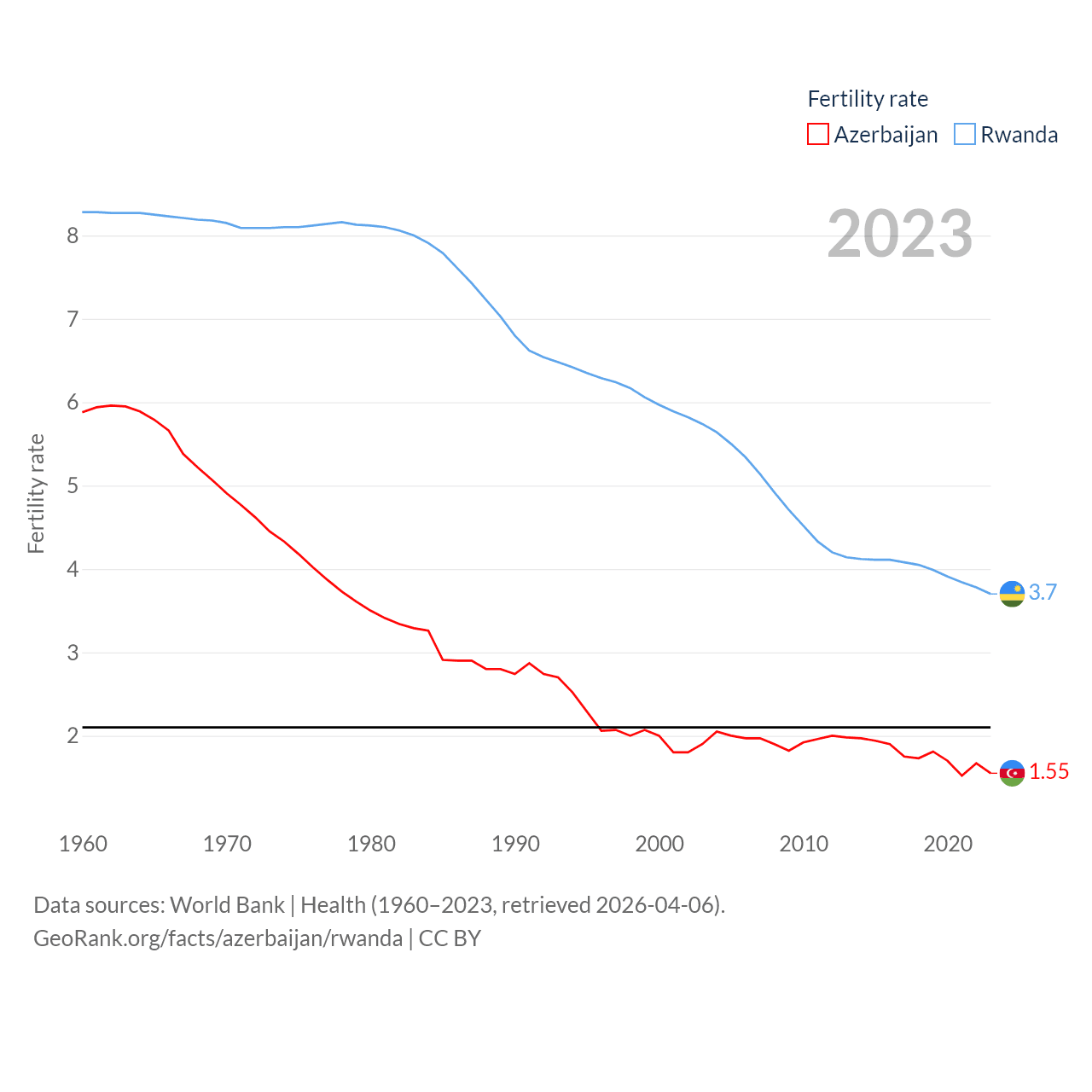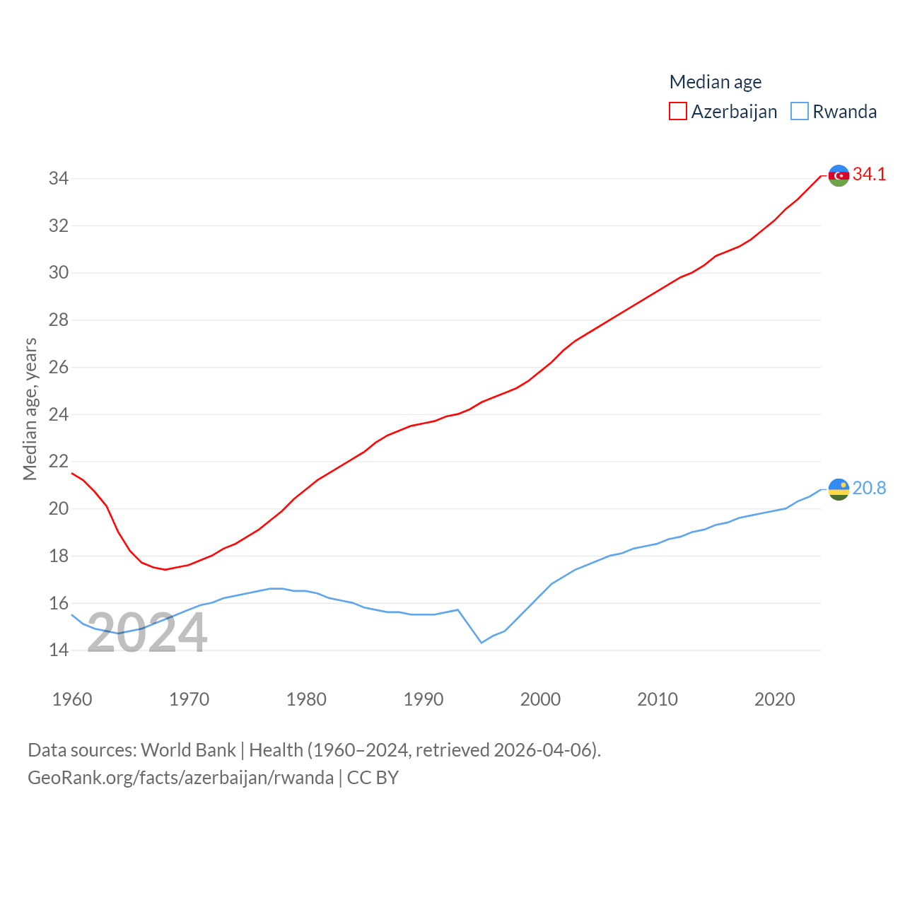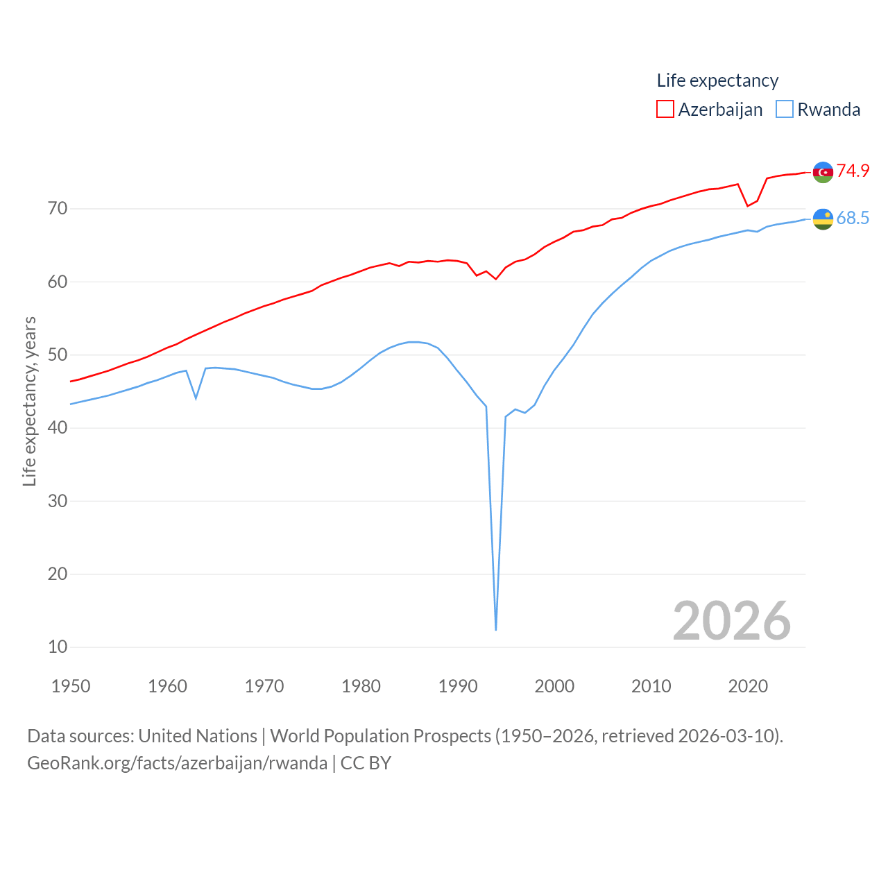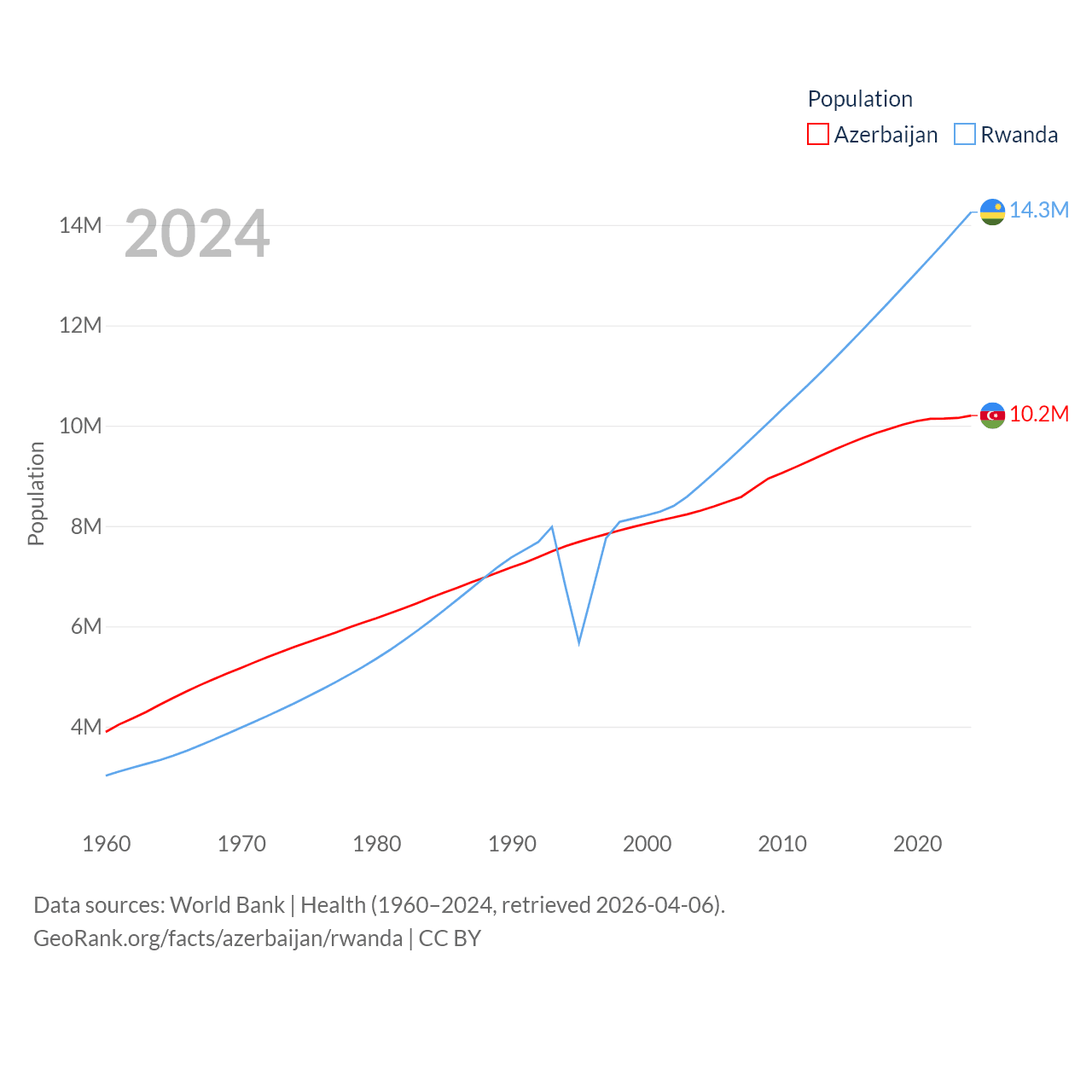 Azerbaijan has a population of 10.2M (ranked 95/197), compared with 14.3M in Rwanda (ranked 77/197). Azerbaijan's land area is 31,911 sq mi versus 9,525 sq mi for Rwanda (ranked 112th vs. 146th).