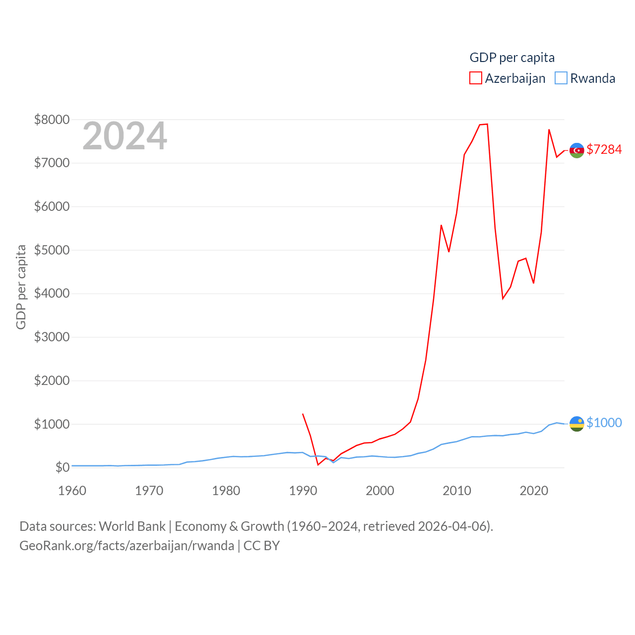By GDP, Azerbaijan ranks 84/197 ($74.3B) and Rwanda ranks 144/197 ($14.3B). By GDP per capita, Azerbaijan ranks 101/197 ($7,284), while Rwanda ranks 178/197 ($1,000).