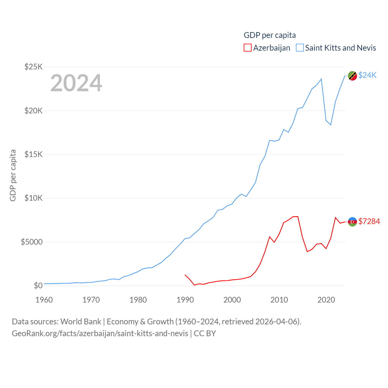 By GDP, Azerbaijan ranks 84/197 ($74.3B) and Saint Kitts and Nevis ranks 187/197 ($1.12B). By GDP per capita, Azerbaijan ranks 101/197 ($7,284), while Saint Kitts and Nevis ranks 51/197 ($23,961).