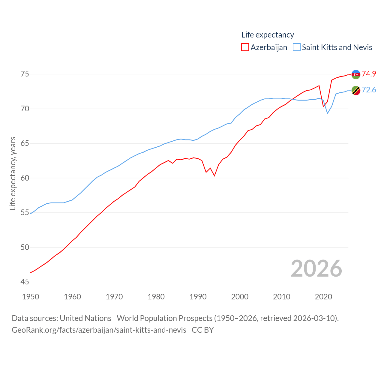Azerbaijan has a population of 10.2M (ranked 95/197), compared with 46.8K in Saint Kitts and Nevis (ranked 189/197). Azerbaijan's land area is 31,911 sq mi versus 100.4 sq mi for Saint Kitts and Nevis (ranked 112th vs. 189th).