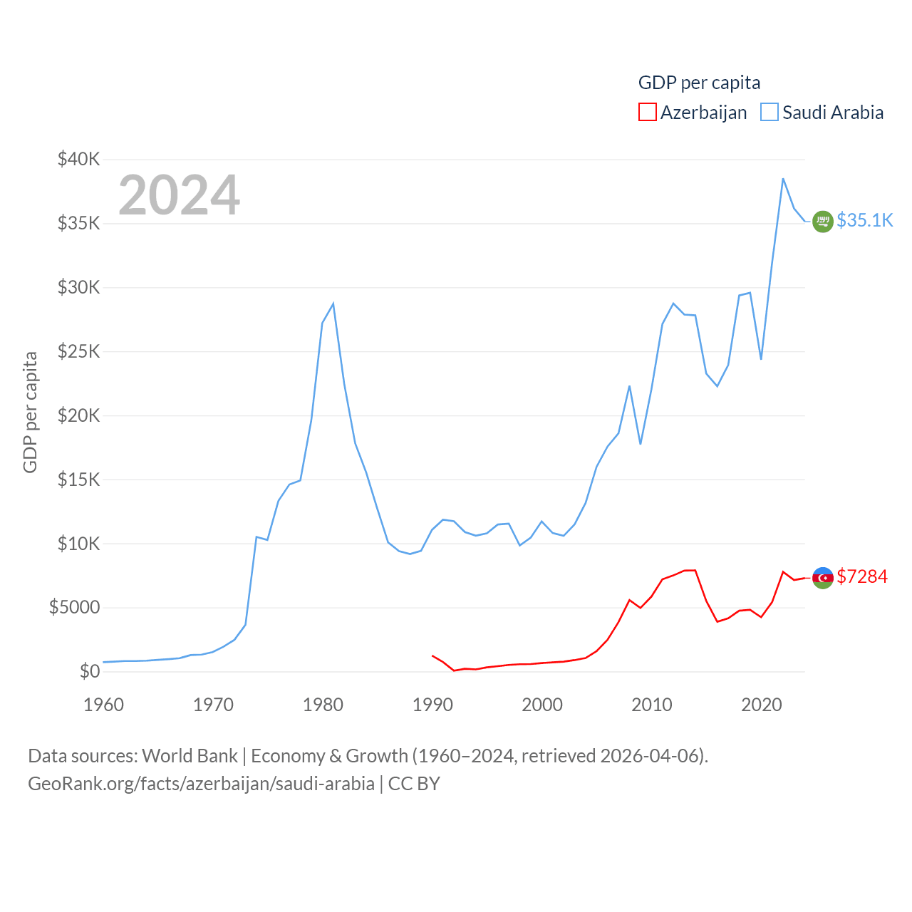 By GDP, Azerbaijan ranks 84/197 ($74.3B) and Saudi Arabia ranks 18/197 ($1.24T). By GDP per capita, Azerbaijan ranks 101/197 ($7,284), while Saudi Arabia ranks 33/197 ($35,122).