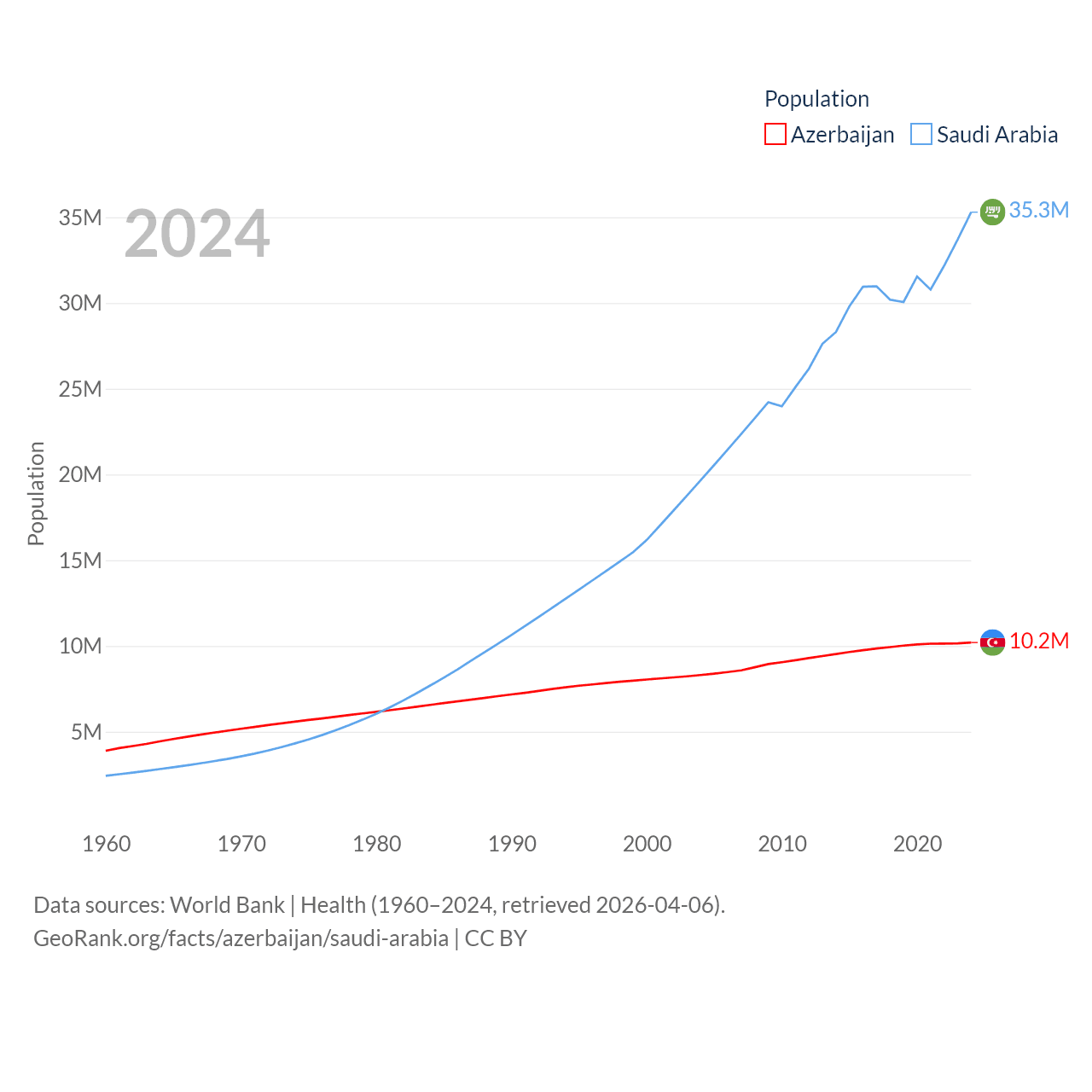 Azerbaijan has a population of 10.2M (ranked 95/197), compared with 35.3M in Saudi Arabia (ranked 45/197). Azerbaijan's land area is 31,911 sq mi versus 830,000 sq mi for Saudi Arabia (ranked 112th vs. 12th).