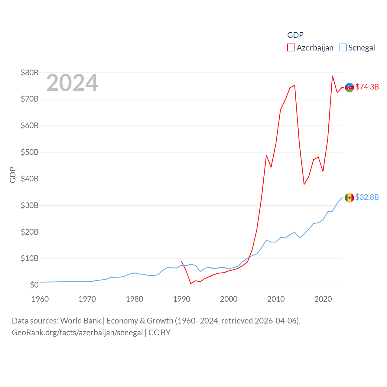 By GDP, Azerbaijan ranks 84/197 ($74.3B) and Senegal ranks 109/197 ($32.8B). By GDP per capita, Azerbaijan ranks 101/197 ($7,284), while Senegal ranks 159/197 ($1,773).