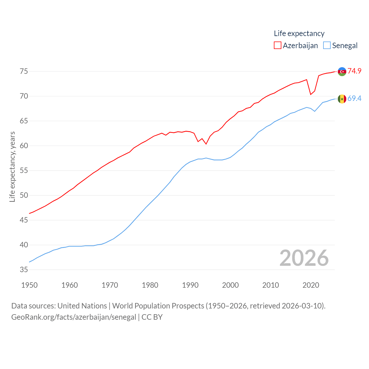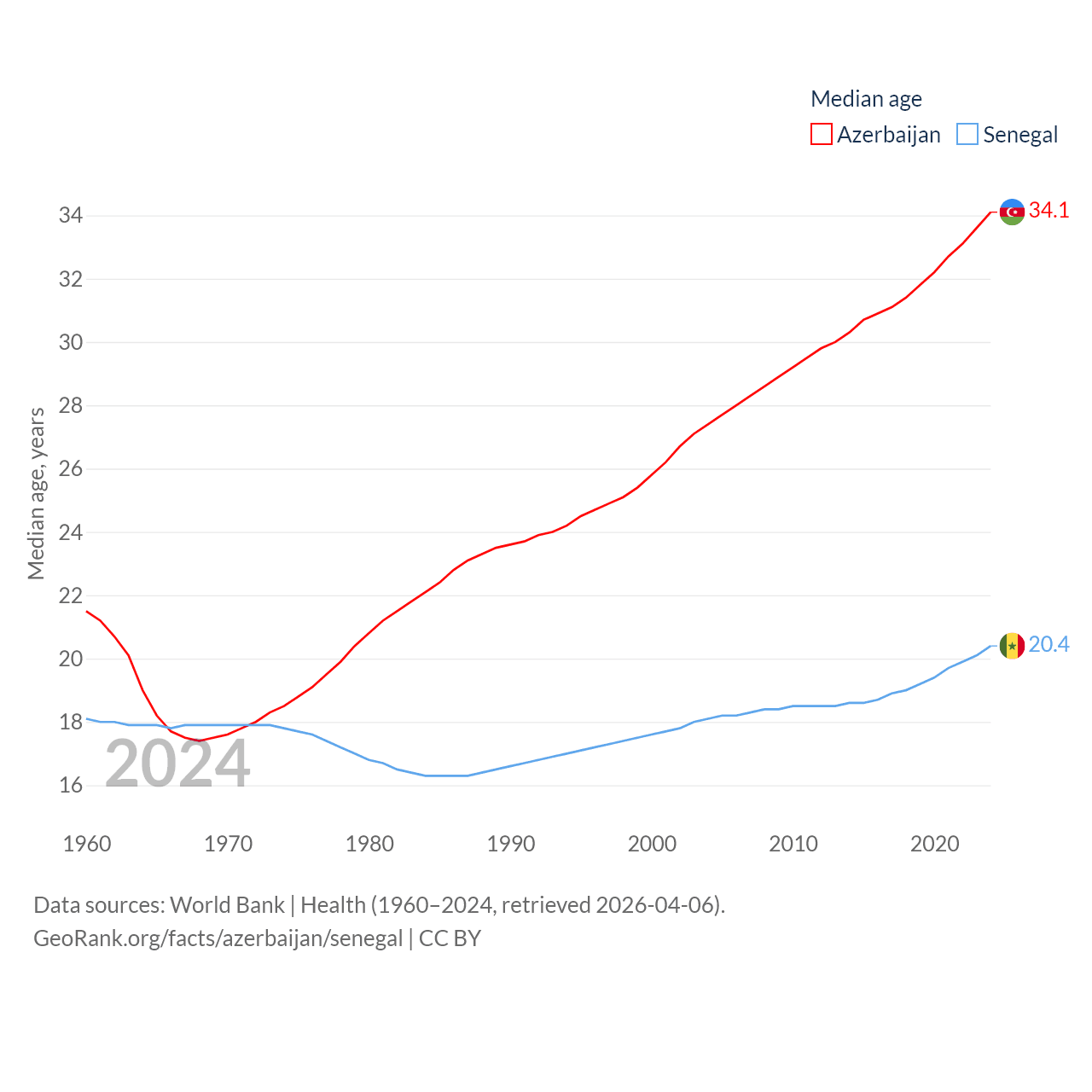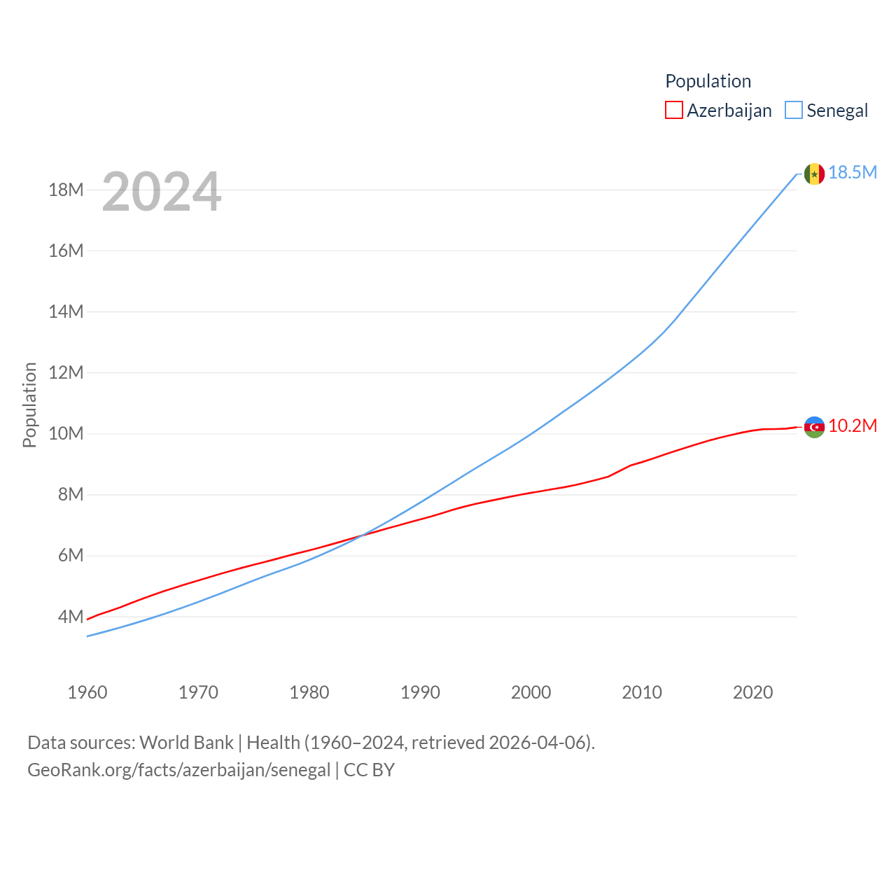 Azerbaijan has a population of 10.2M (ranked 95/197), compared with 18.5M in Senegal (ranked 69/197). Azerbaijan's land area is 31,911 sq mi versus 74,336 sq mi for Senegal (ranked 112th vs. 85th).