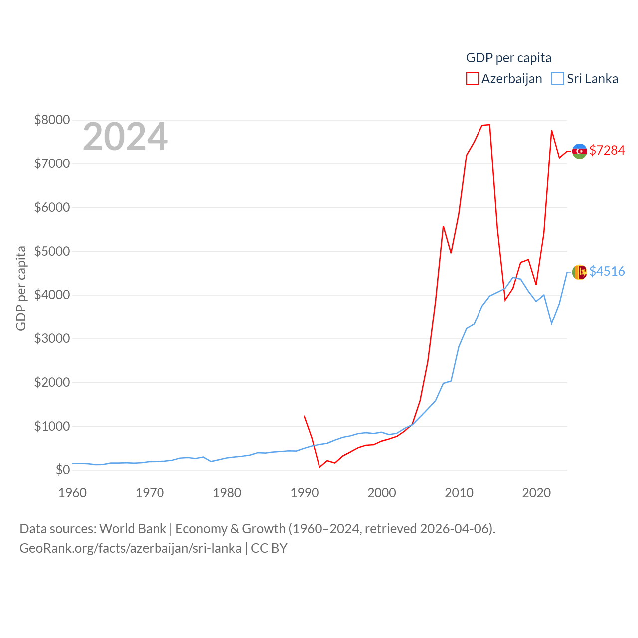 By GDP, Azerbaijan ranks 84/197 ($74.3B) and Sri Lanka ranks 72/197 ($99B). By GDP per capita, Azerbaijan ranks 101/197 ($7,284), while Sri Lanka ranks 124/197 ($4,516).