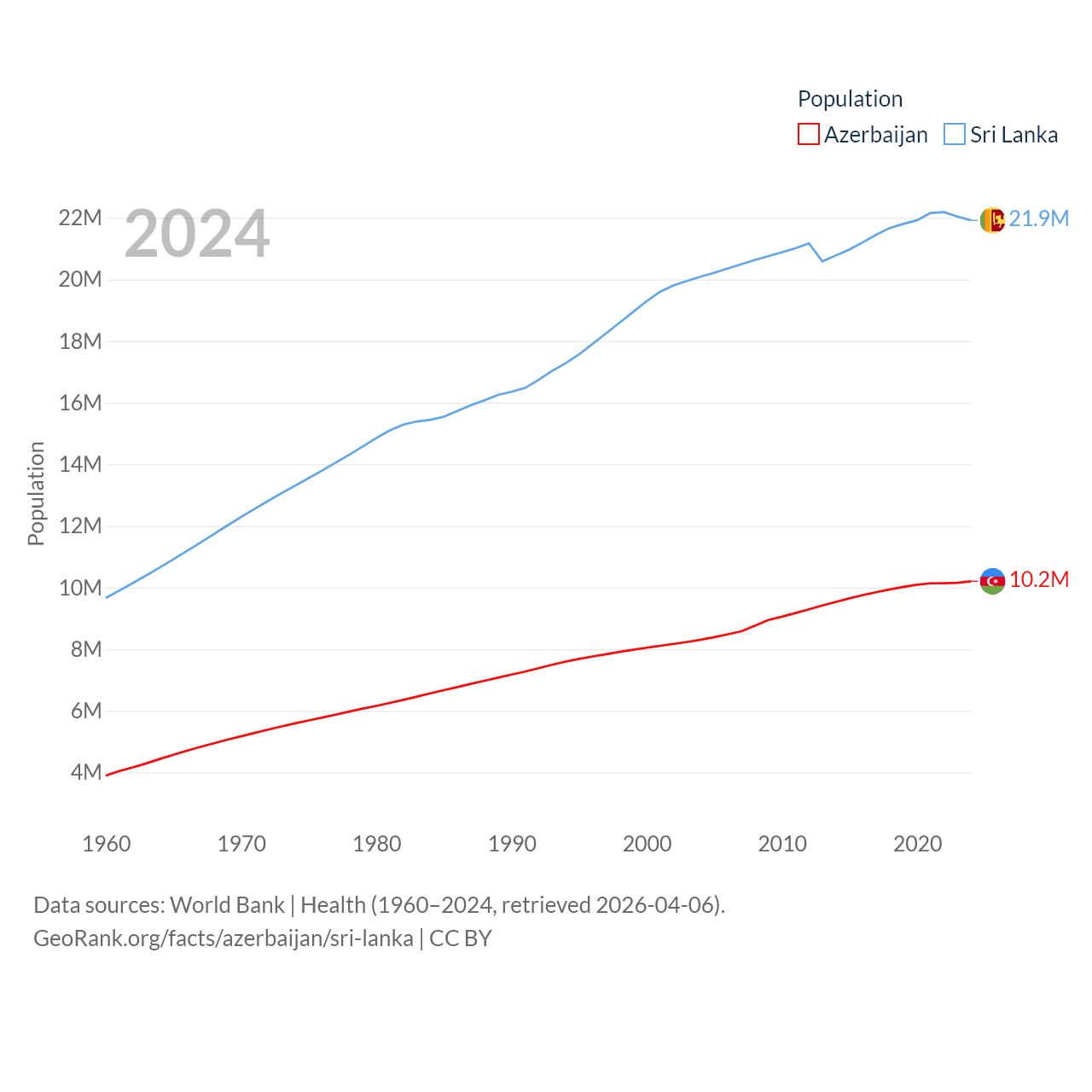 Azerbaijan has a population of 10.2M (ranked 95/197), compared with 21.9M in Sri Lanka (ranked 61/197). Azerbaijan's land area is 31,911 sq mi versus 23,884 sq mi for Sri Lanka (ranked 112th vs. 122nd).