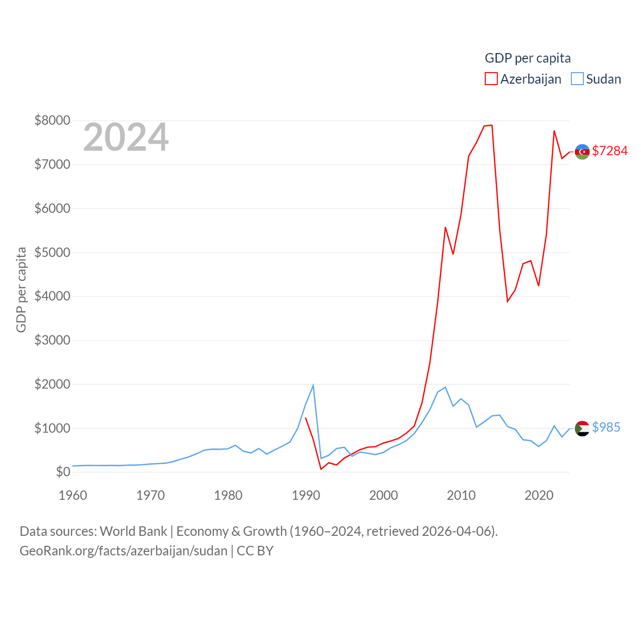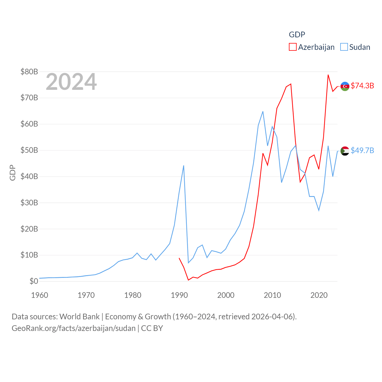 By GDP, Azerbaijan ranks 84/197 ($74.3B) and Sudan ranks 94/197 ($49.7B). By GDP per capita, Azerbaijan ranks 101/197 ($7,284), while Sudan ranks 179/197 ($985).