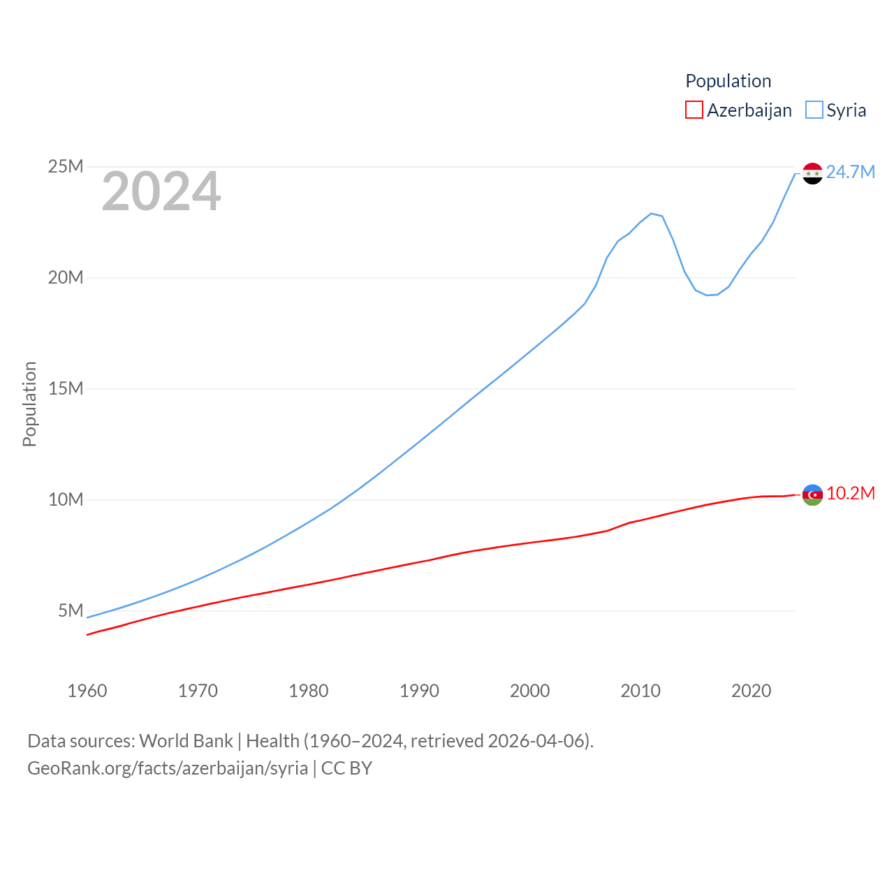 Azerbaijan has a population of 10.2M (ranked 95/197), compared with 24.7M in Syria (ranked 57/197). Azerbaijan's land area is 31,911 sq mi versus 70,900 sq mi for Syria (ranked 112th vs. 87th).