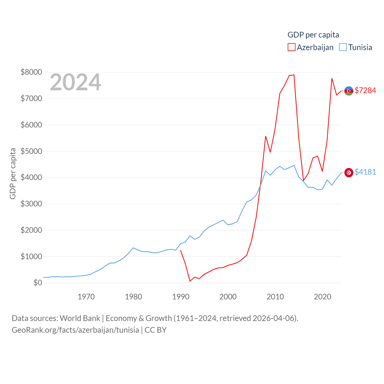 By GDP, Azerbaijan ranks 84/197 ($74.3B) and Tunisia ranks 93/197 ($51.3B). By GDP per capita, Azerbaijan ranks 101/197 ($7,284), while Tunisia ranks 129/197 ($4,181).