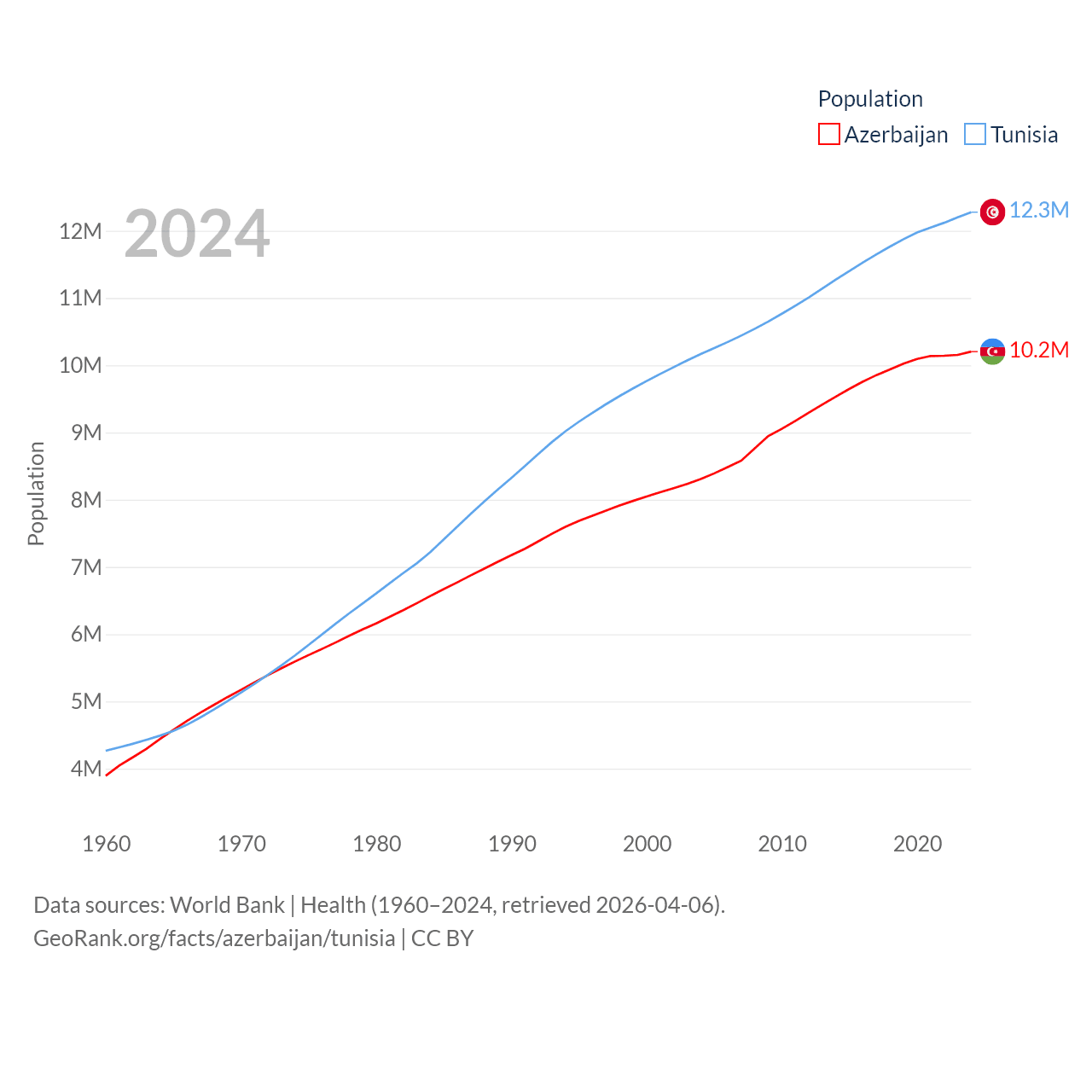 Azerbaijan has a population of 10.2M (ranked 95/197), compared with 12.3M in Tunisia (ranked 80/197). Azerbaijan's land area is 31,911 sq mi versus 59,985 sq mi for Tunisia (ranked 112th vs. 91st).