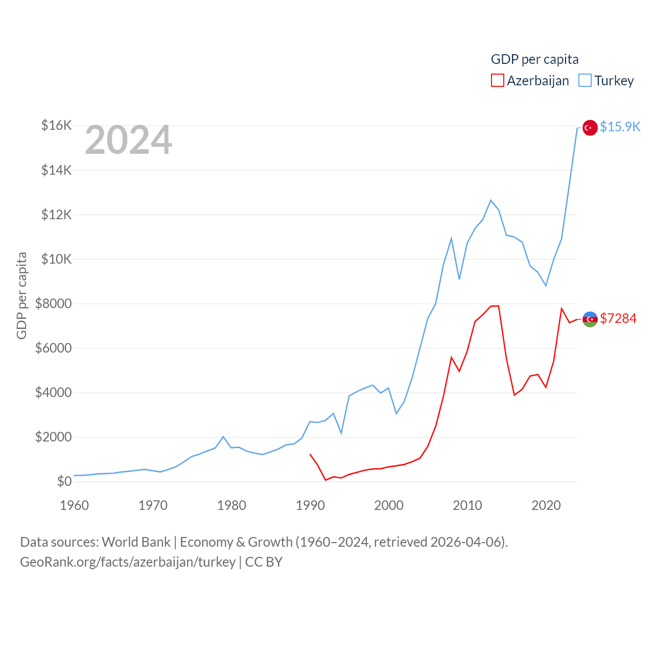 By GDP, Azerbaijan ranks 84/197 ($74.3B) and Turkey ranks 17/197 ($1.36T). By GDP per capita, Azerbaijan ranks 101/197 ($7,284), while Turkey ranks 66/197 ($15,893).