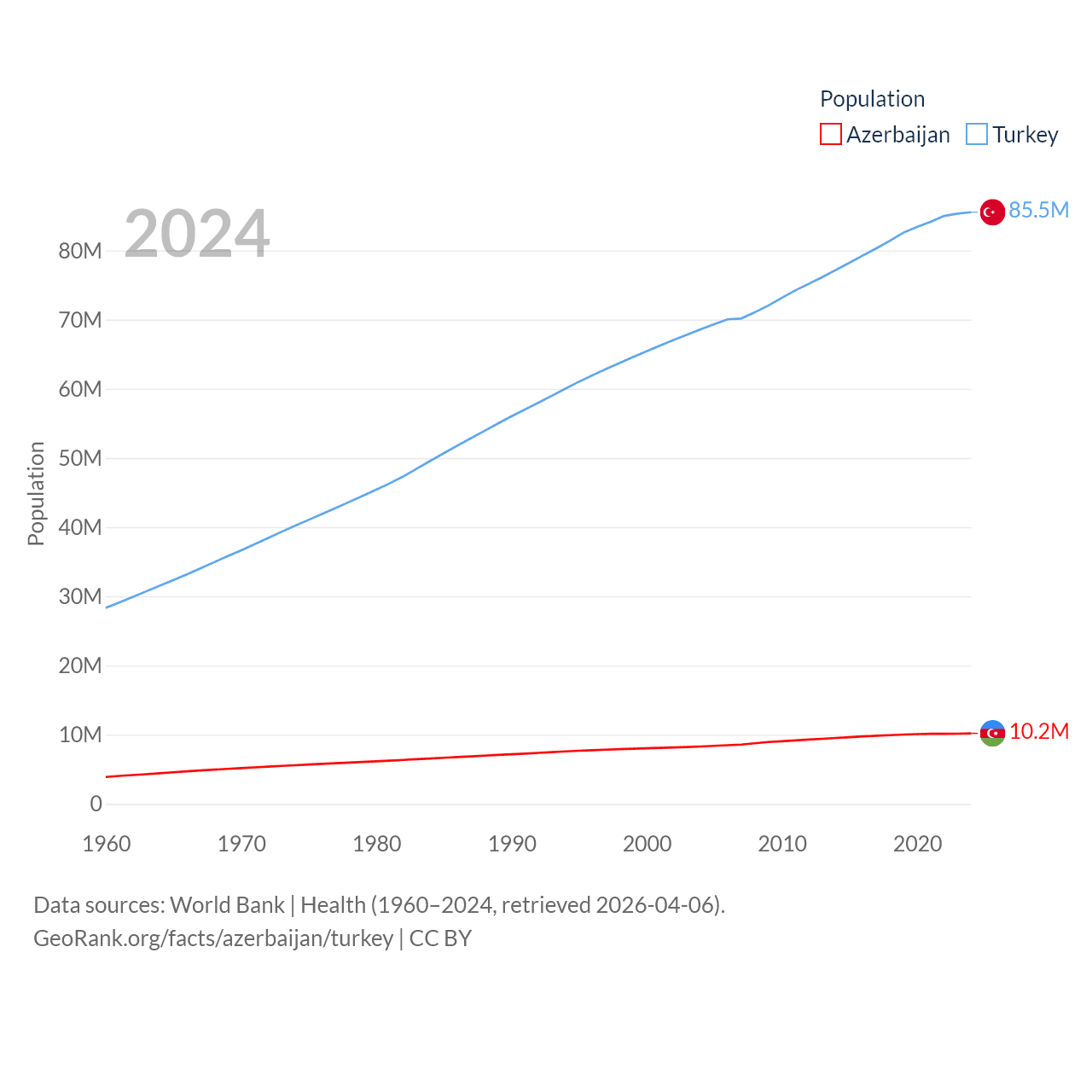 Azerbaijan has a population of 10.2M (ranked 95/197), compared with 85.5M in Turkey (ranked 18/197). Azerbaijan's land area is 31,911 sq mi versus 297,156 sq mi for Turkey (ranked 112th vs. 36th).
