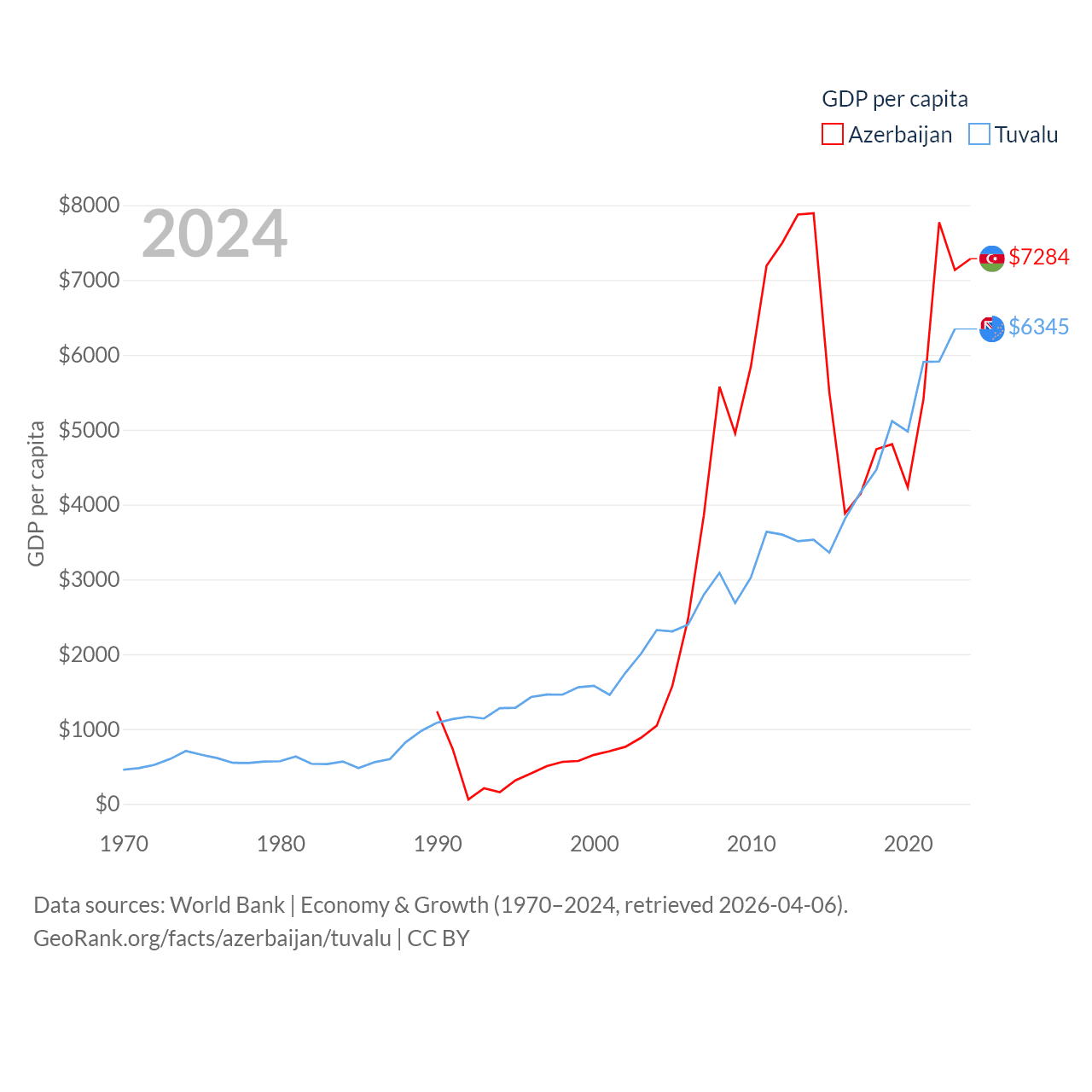 By GDP, Azerbaijan ranks 84/197 ($74.3B) and Tuvalu ranks 196/197 ($62.3M). By GDP per capita, Azerbaijan ranks 101/197 ($7,284), while Tuvalu ranks 110/197 ($6,345).