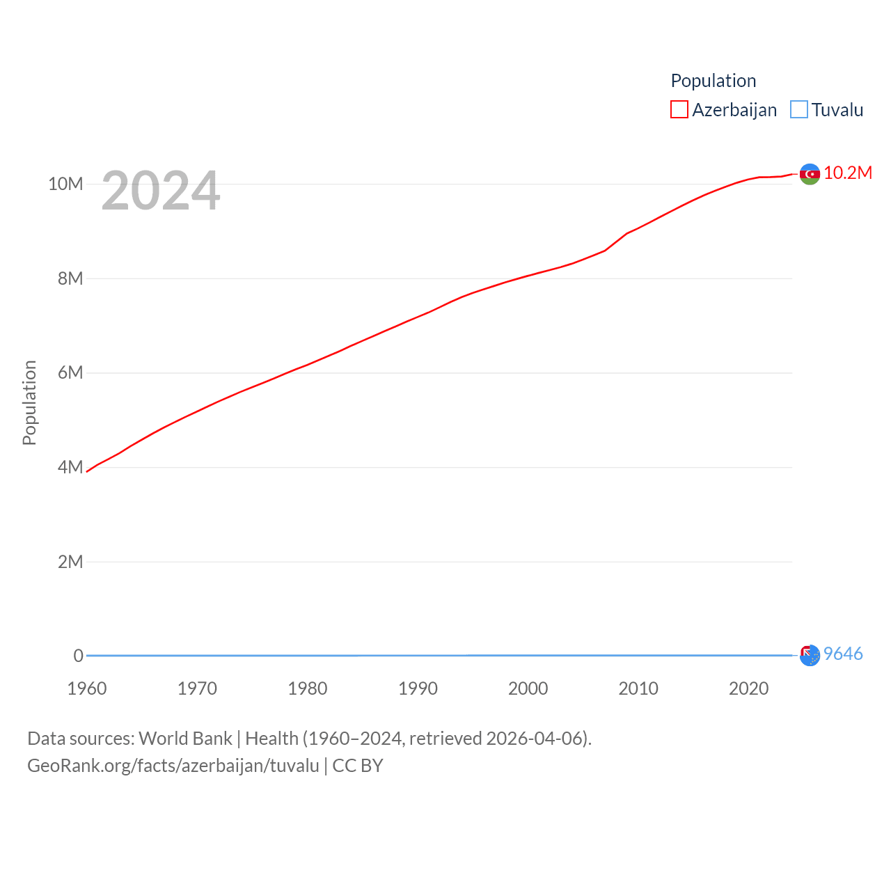 Azerbaijan has a population of 10.2M (ranked 95/197), compared with 9.65K in Tuvalu (ranked 196/197). Azerbaijan's land area is 31,911 sq mi versus 11.6 sq mi for Tuvalu (ranked 112th vs. 194th).