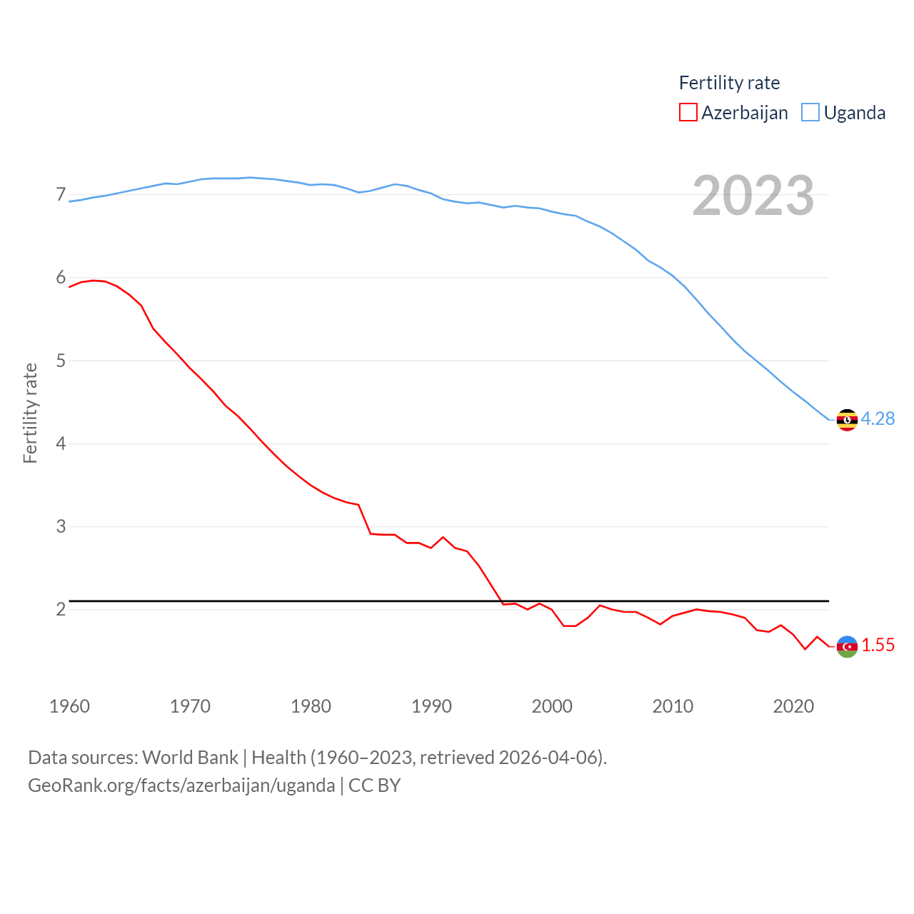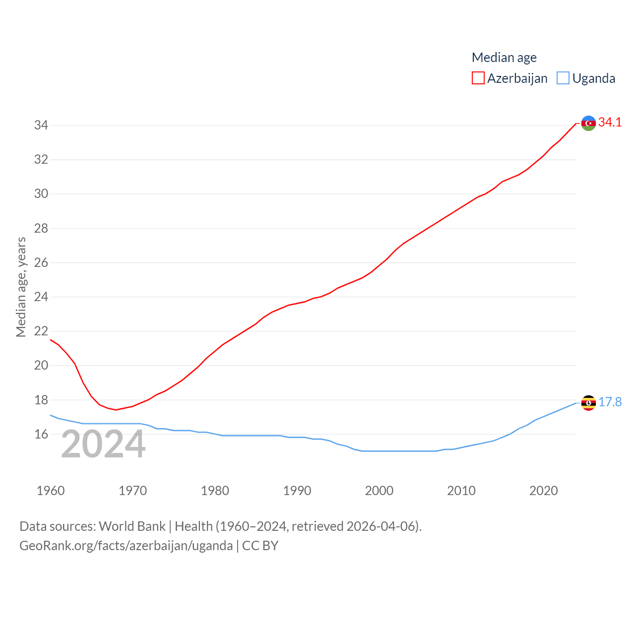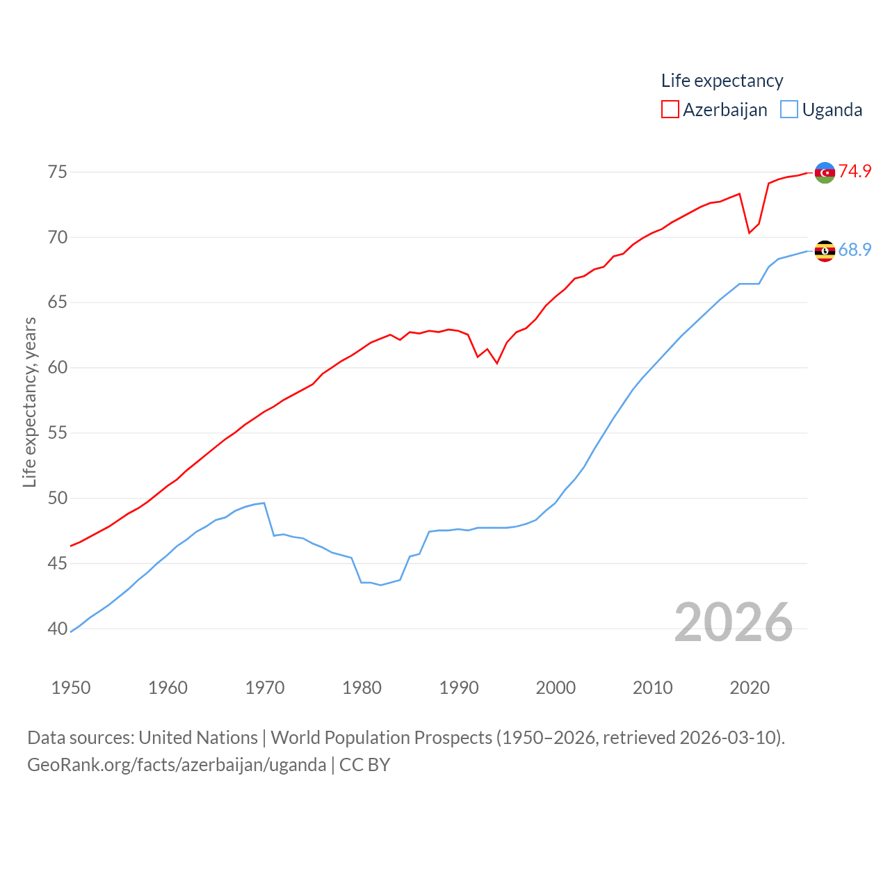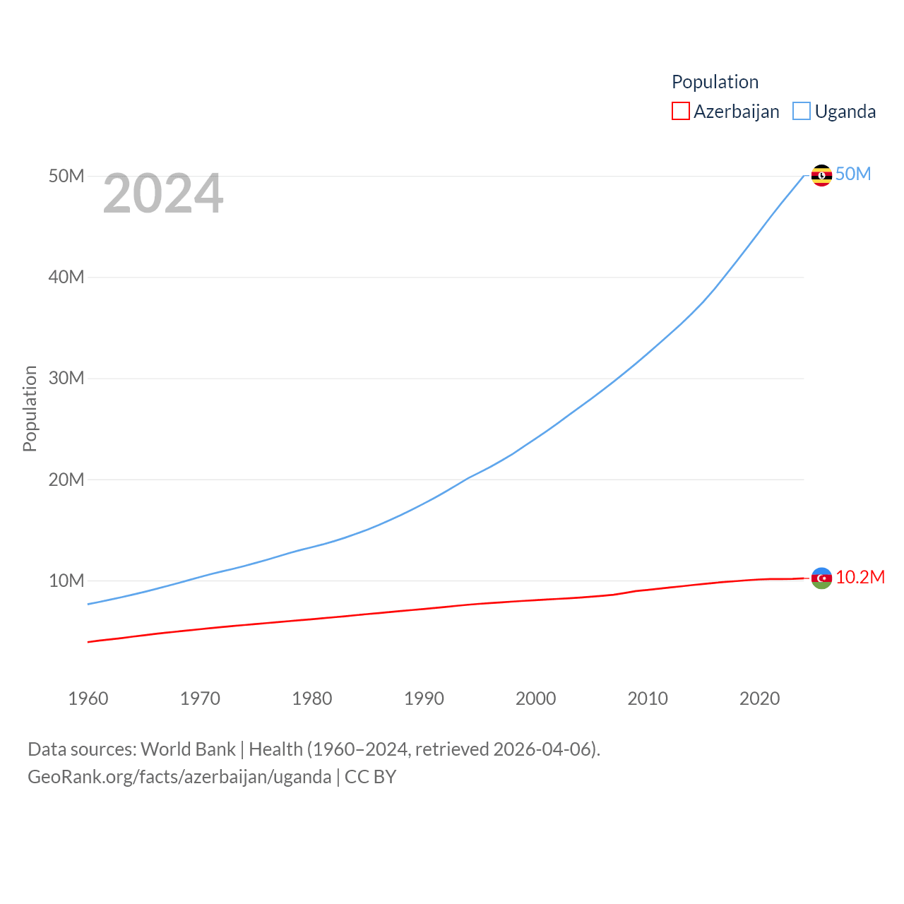 Azerbaijan has a population of 10.2M (ranked 95/197), compared with 50M in Uganda (ranked 31/197). Azerbaijan's land area is 31,911 sq mi versus 77,421 sq mi for Uganda (ranked 112th vs. 84th).
