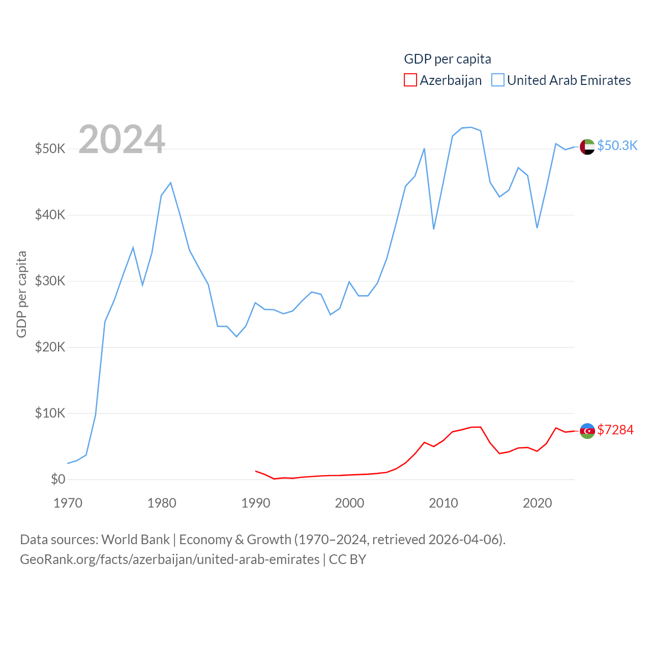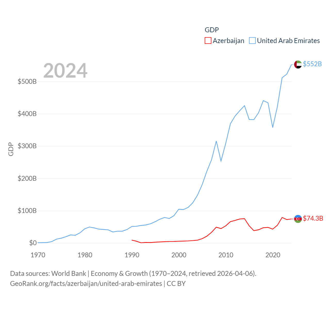 By GDP, Azerbaijan ranks 84/197 ($74.3B) and The United Arab Emirates ranks 27/197 ($552B). By GDP per capita, Azerbaijan ranks 101/197 ($7,284), while The United Arab Emirates ranks 24/197 ($50,274).