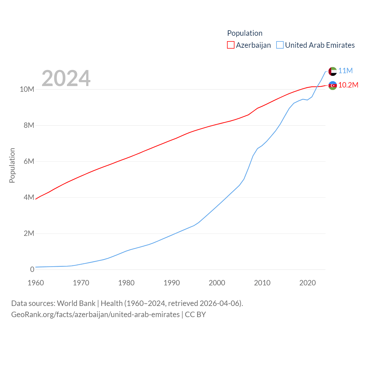 Azerbaijan has a population of 10.2M (ranked 95/197), compared with 11M in The United Arab Emirates (ranked 86/197). Azerbaijan's land area is 31,911 sq mi versus 27,421 sq mi for The United Arab Emirates (ranked 112th vs. 117th).