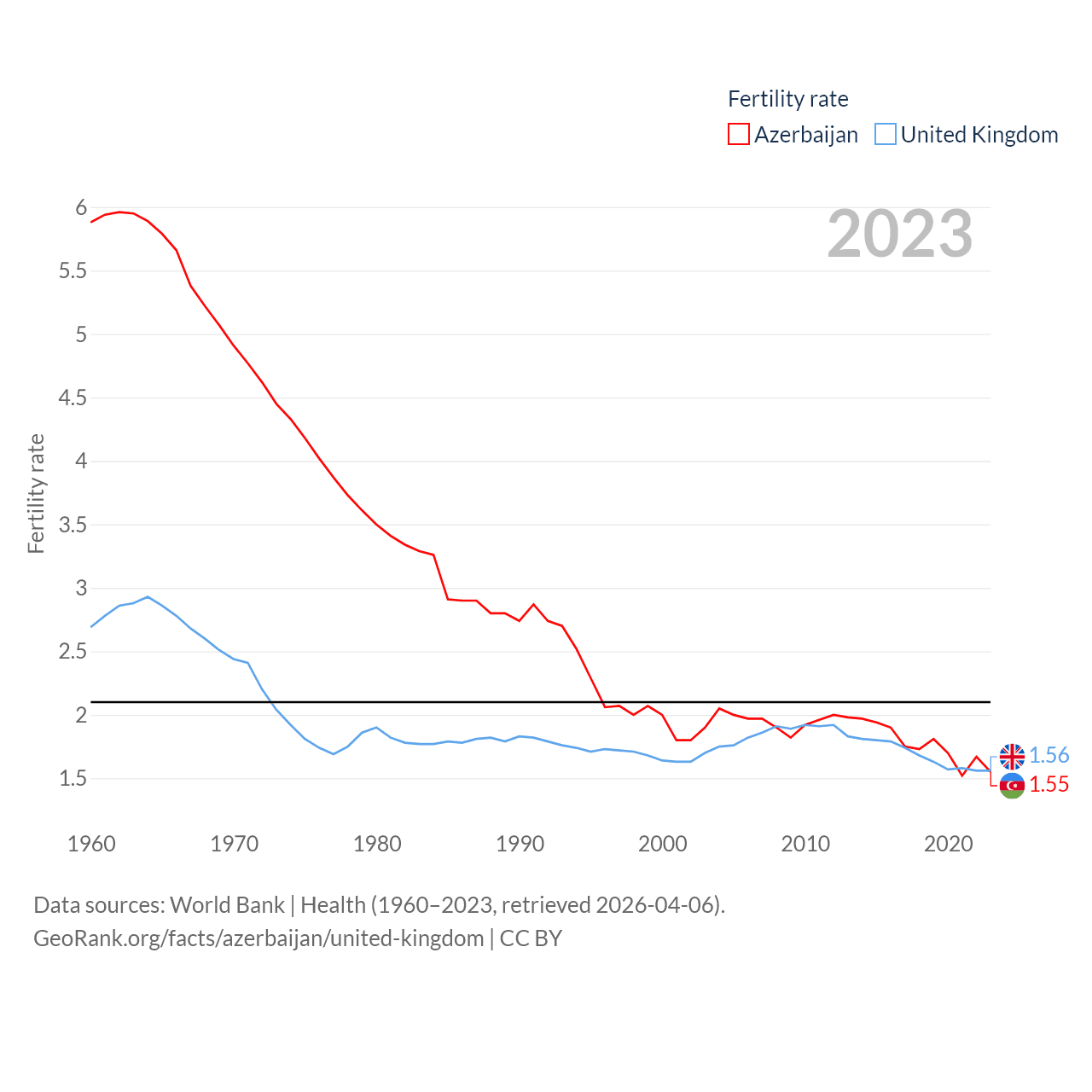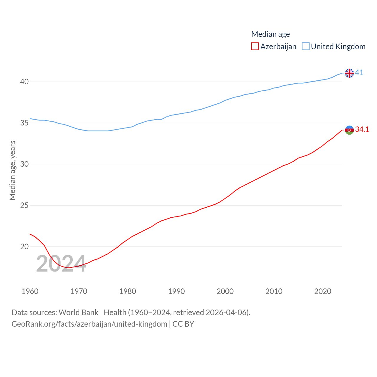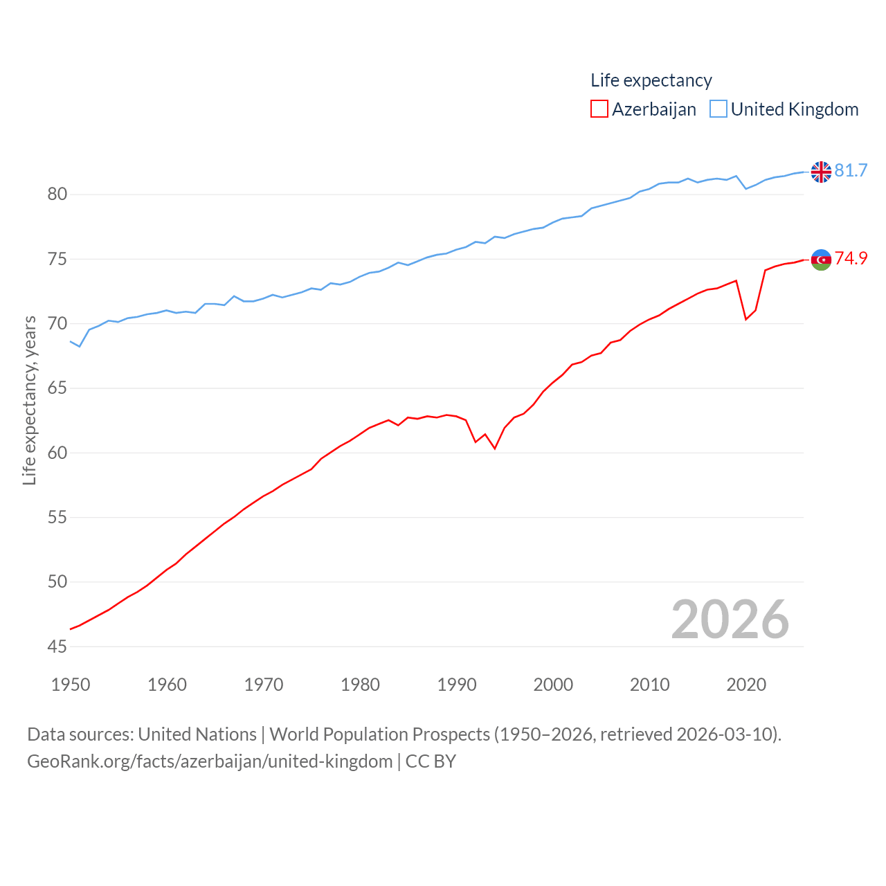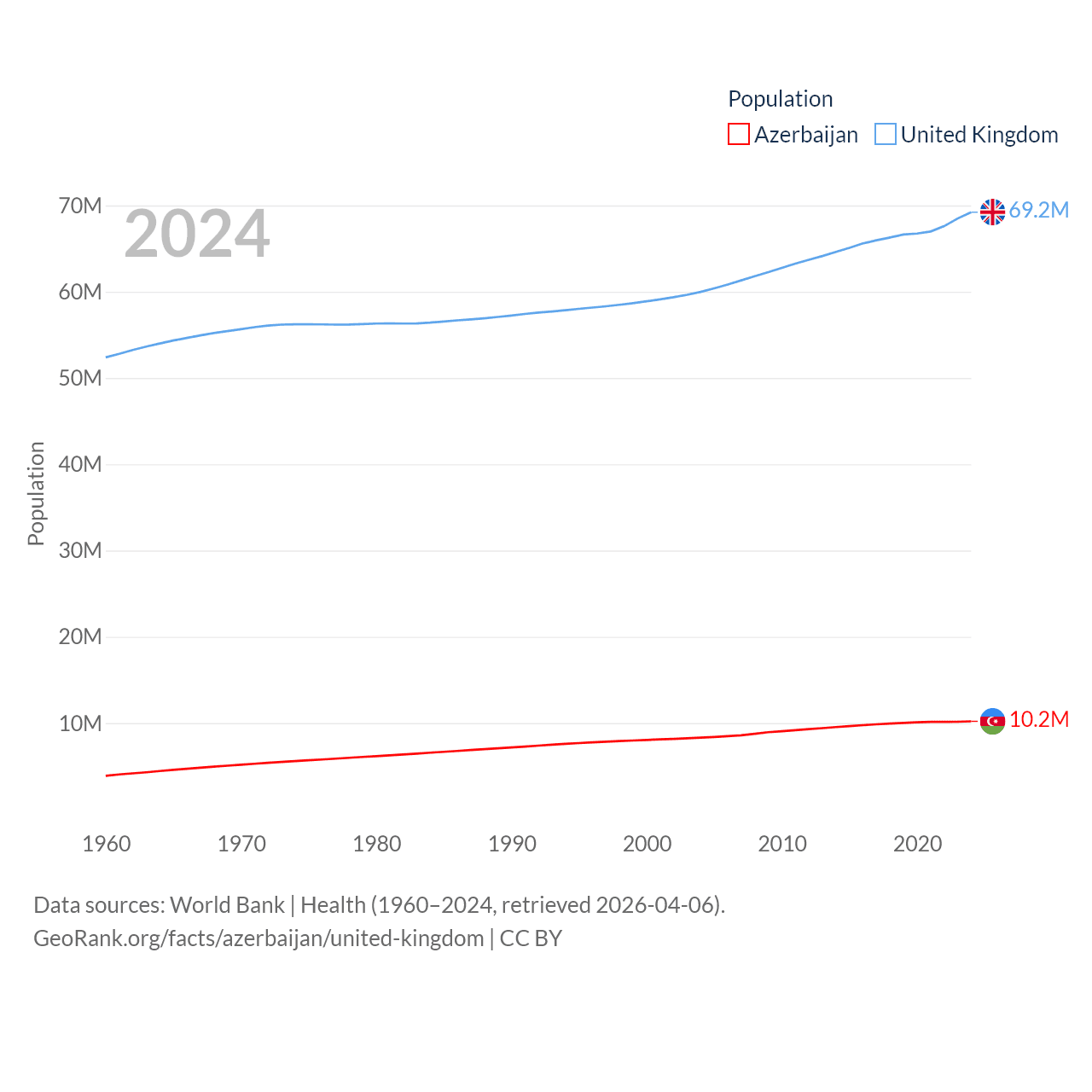 Azerbaijan has a population of 10.2M (ranked 95/197), compared with 69.2M in The United Kingdom (ranked 21/197). Azerbaijan's land area is 31,911 sq mi versus 93,410 sq mi for The United Kingdom (ranked 112th vs. 78th).