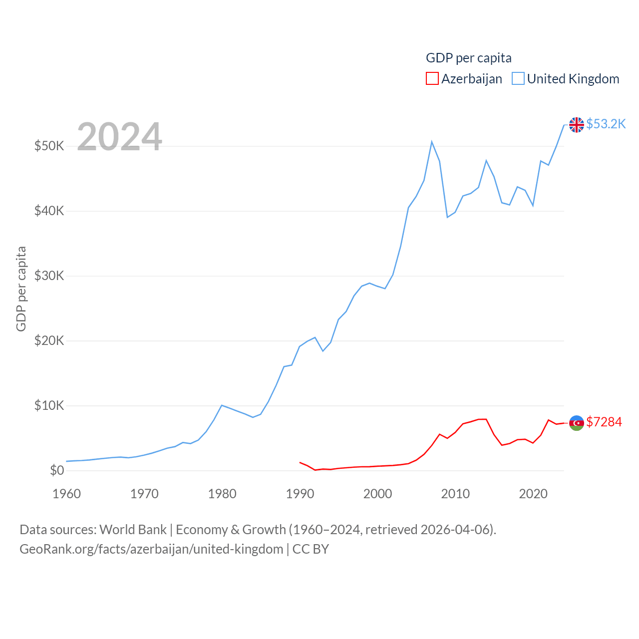By GDP, Azerbaijan ranks 84/197 ($74.3B) and The United Kingdom ranks 6/197 ($3.69T). By GDP per capita, Azerbaijan ranks 101/197 ($7,284), while The United Kingdom ranks 22/197 ($53,246).
