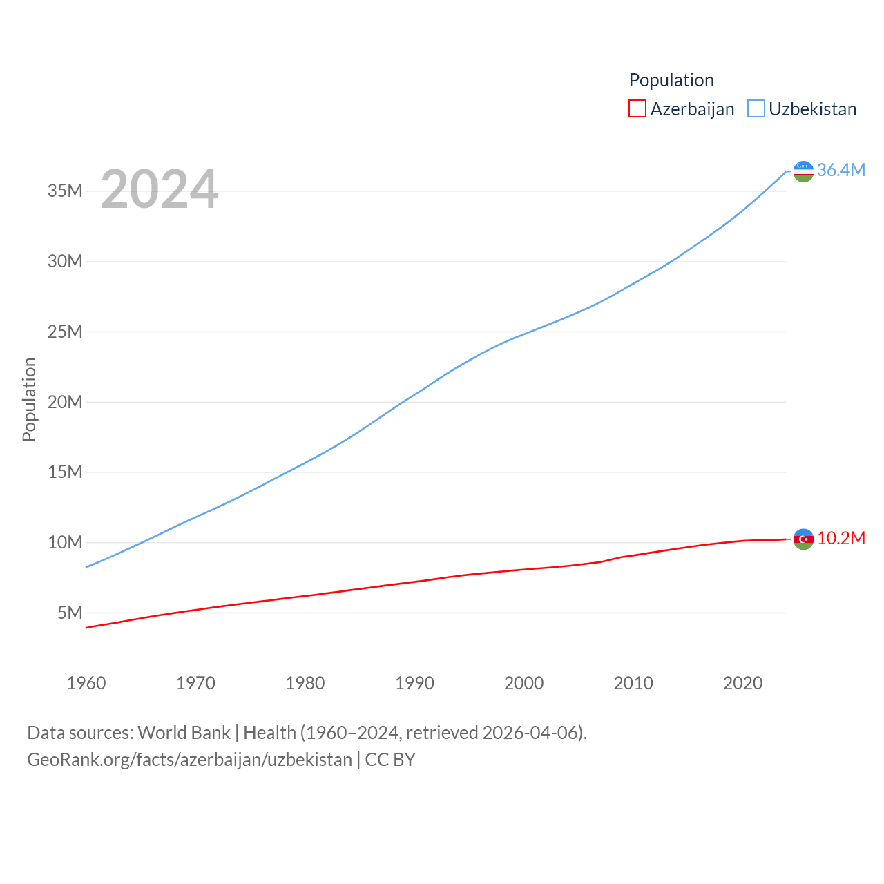 Azerbaijan has a population of 10.2M (ranked 95/197), compared with 36.4M in Uzbekistan (ranked 43/197). Azerbaijan's land area is 31,911 sq mi versus 170,136 sq mi for Uzbekistan (ranked 112th vs. 56th).