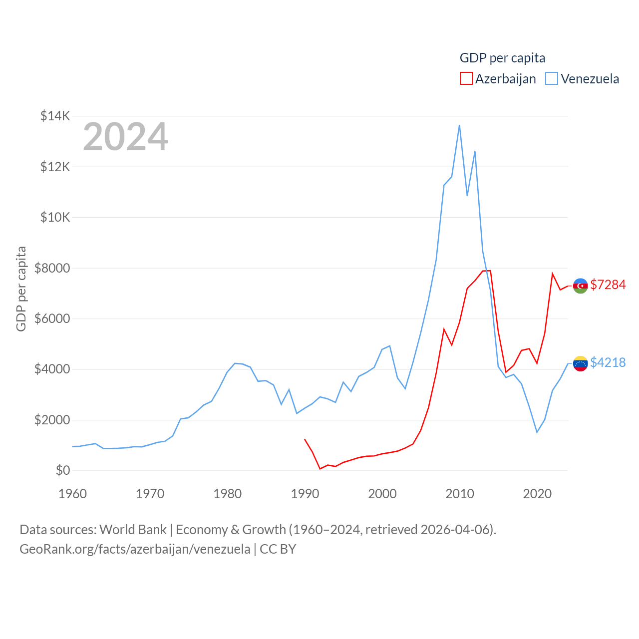By GDP, Azerbaijan ranks 84/197 ($74.3B) and Venezuela ranks 65/197 ($120B). By GDP per capita, Azerbaijan ranks 101/197 ($7,284), while Venezuela ranks 128/197 ($4,218).