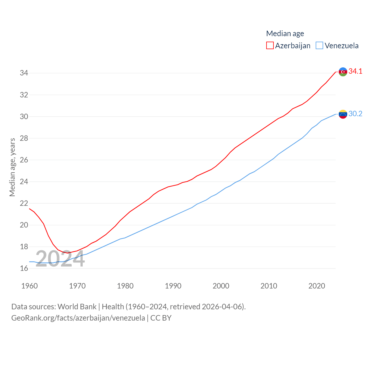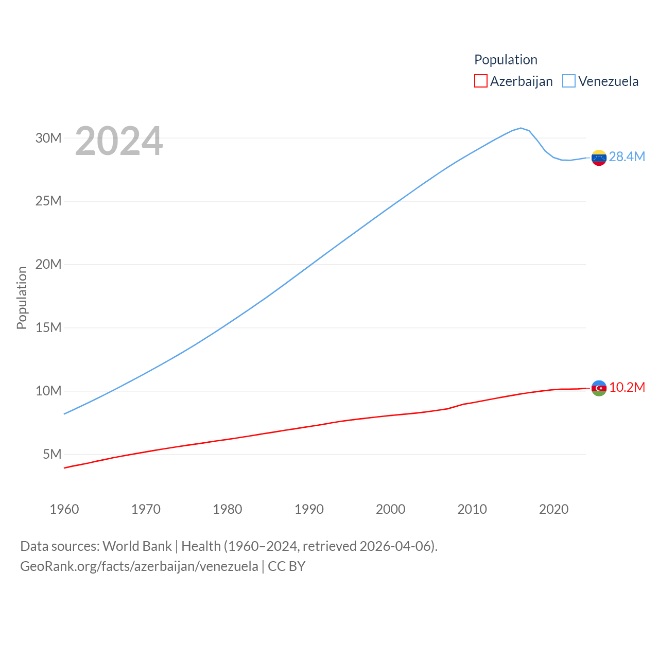 Azerbaijan has a population of 10.2M (ranked 95/197), compared with 28.4M in Venezuela (ranked 53/197). Azerbaijan's land area is 31,911 sq mi versus 340,561 sq mi for Venezuela (ranked 112th vs. 32nd).