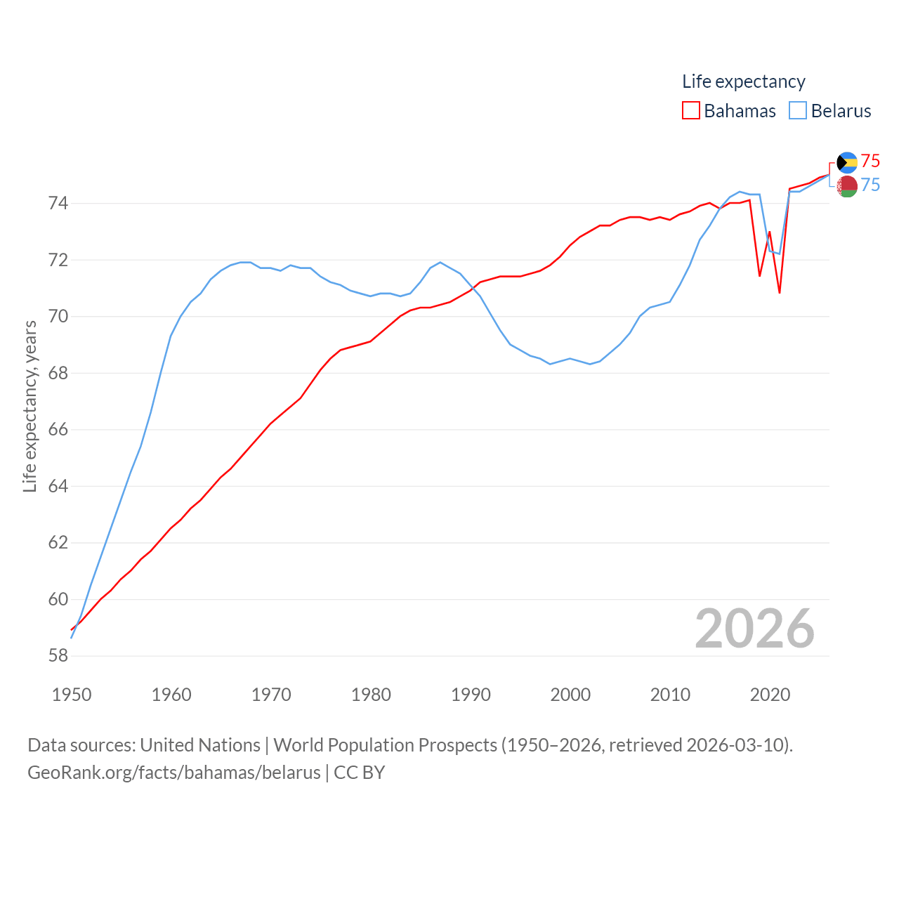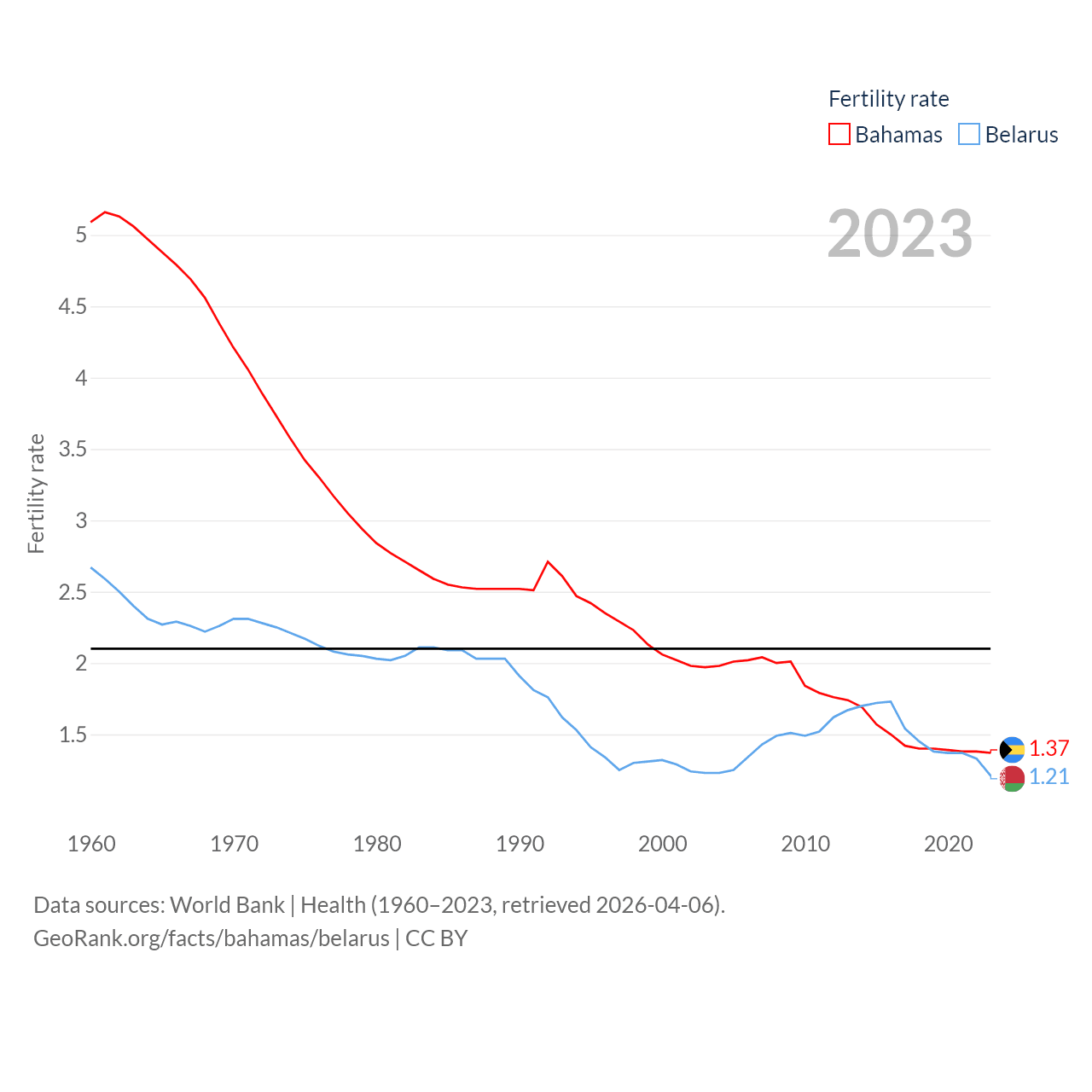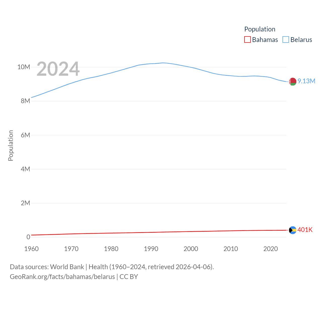 The Bahamas has a population of 401K (ranked 172/197), compared with 9.13M in Belarus (ranked 100/197). The Bahamas' land area is 3,865 sq mi versus 78,372 sq mi for Belarus (ranked 162nd vs. 83rd).