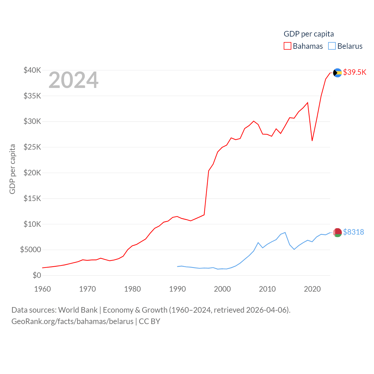 By GDP, The Bahamas ranks 140/197 ($15.8B) and Belarus ranks 83/197 ($76B). By GDP per capita, The Bahamas ranks 30/197 ($39,455), while Belarus ranks 92/197 ($8,318).
