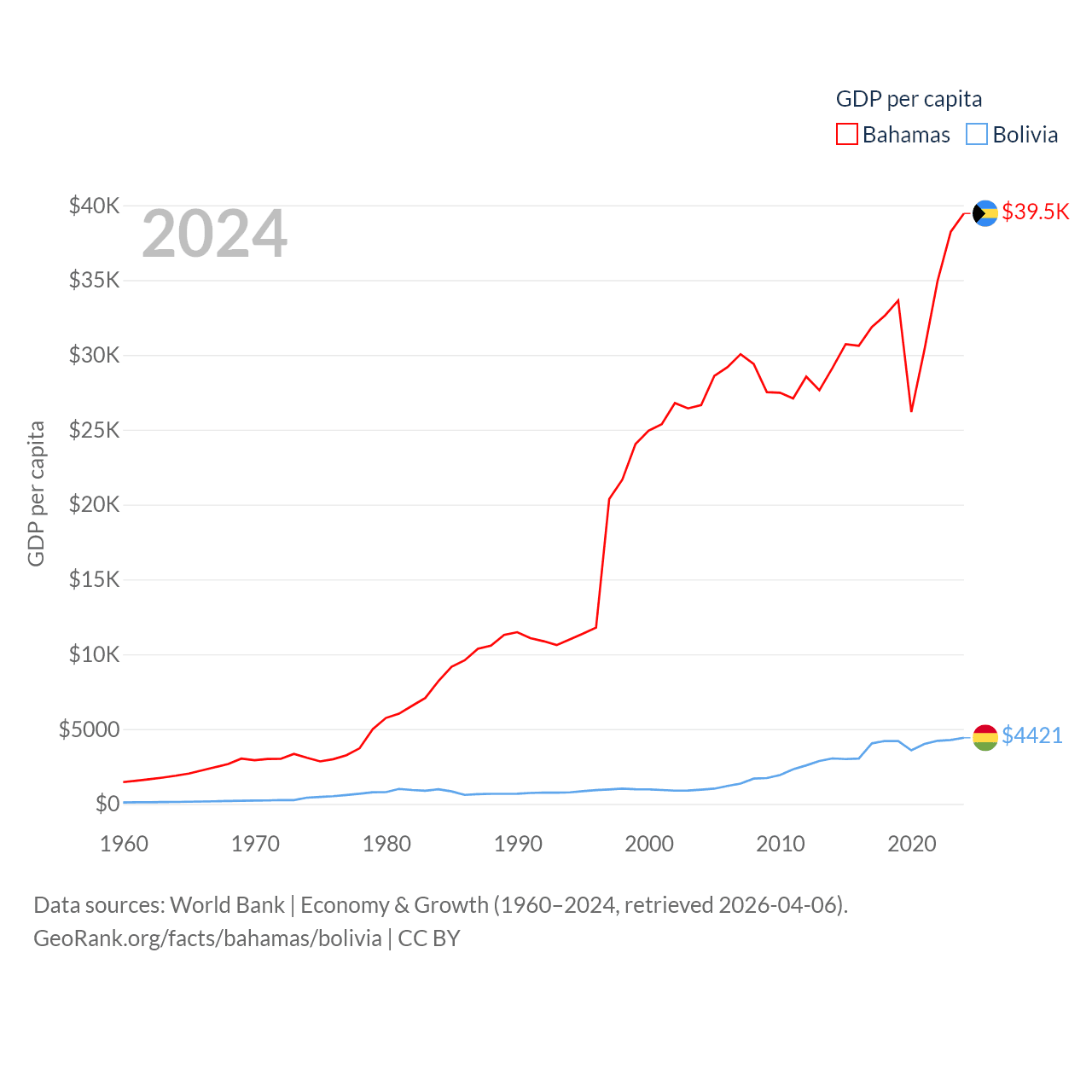 By GDP, The Bahamas ranks 140/197 ($15.8B) and Bolivia ranks 88/197 ($54.9B). By GDP per capita, The Bahamas ranks 30/197 ($39,455), while Bolivia ranks 125/197 ($4,421).