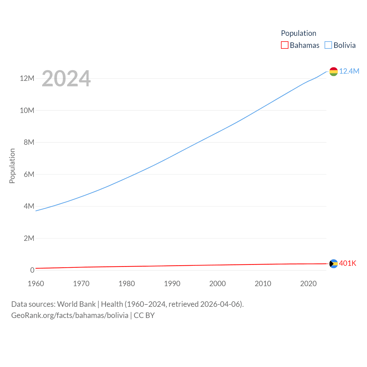 The Bahamas has a population of 401K (ranked 172/197), compared with 12.4M in Bolivia (ranked 79/197). The Bahamas' land area is 3,865 sq mi versus 418,264 sq mi for Bolivia (ranked 162nd vs. 27th).
