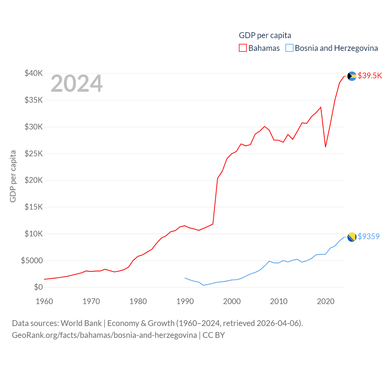 By GDP, The Bahamas ranks 140/197 ($15.8B) and Bosnia and Herzegovina ranks 111/197 ($29.6B). By GDP per capita, The Bahamas ranks 30/197 ($39,455), while Bosnia and Herzegovina ranks 87/197 ($9,359).