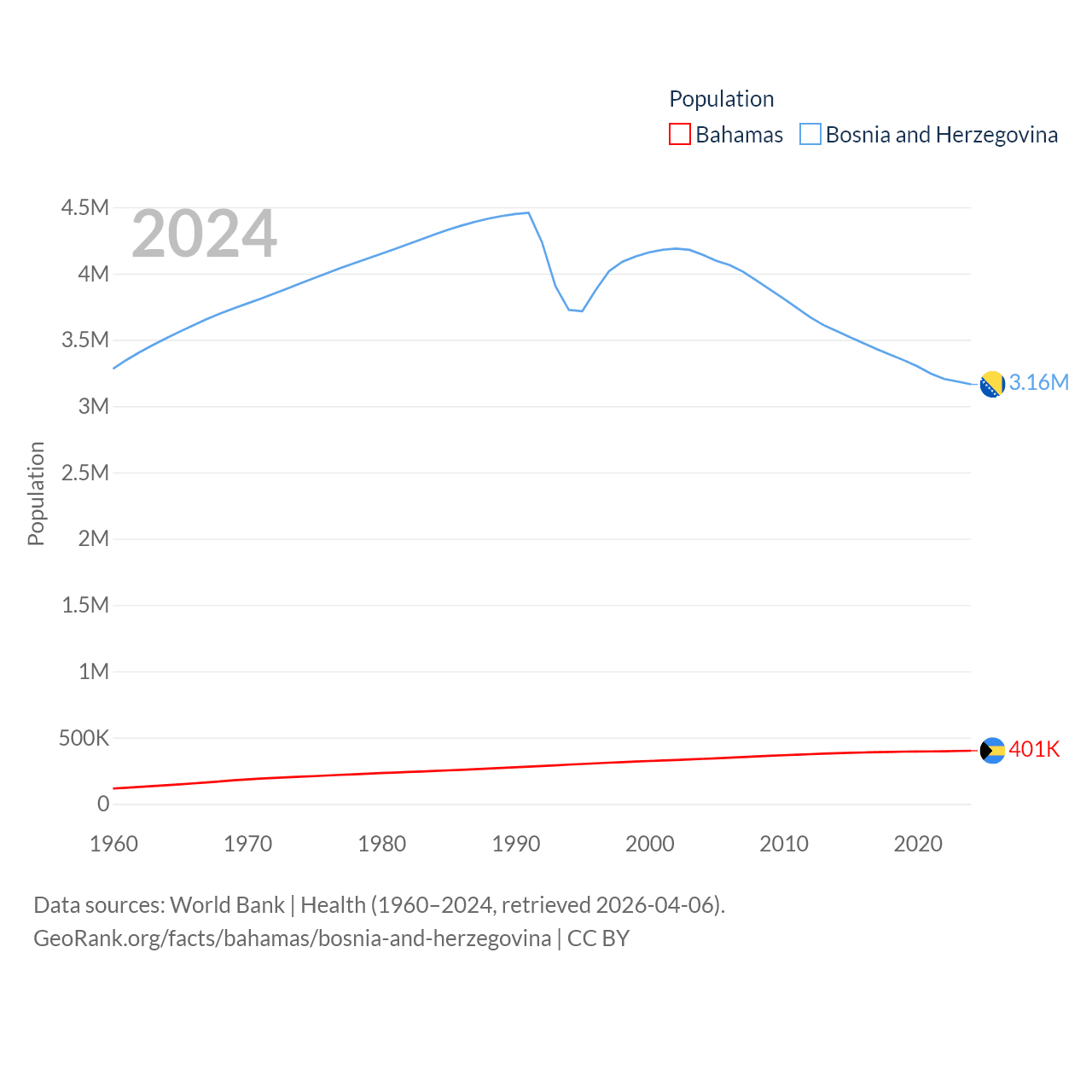 The Bahamas has a population of 401K (ranked 172/197), compared with 3.16M in Bosnia and Herzegovina (ranked 134/197). The Bahamas' land area is 3,865 sq mi versus 19,768 sq mi for Bosnia and Herzegovina (ranked 162nd vs. 125th).