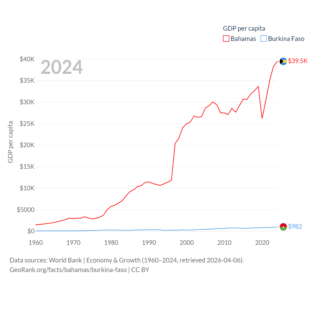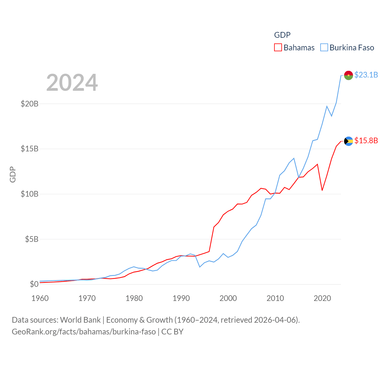 By GDP, The Bahamas ranks 140/197 ($15.8B) and Burkina Faso ranks 122/197 ($23.1B). By GDP per capita, The Bahamas ranks 30/197 ($39,455), while Burkina Faso ranks 180/197 ($982).
