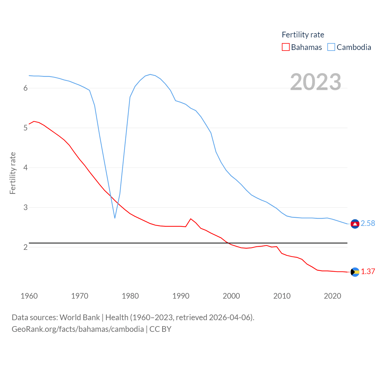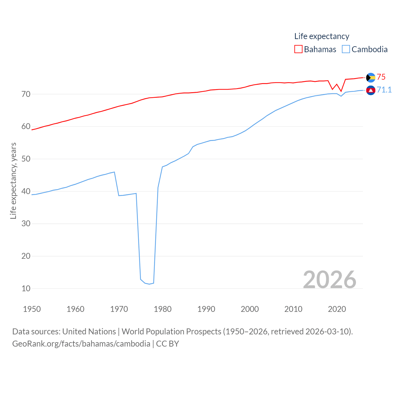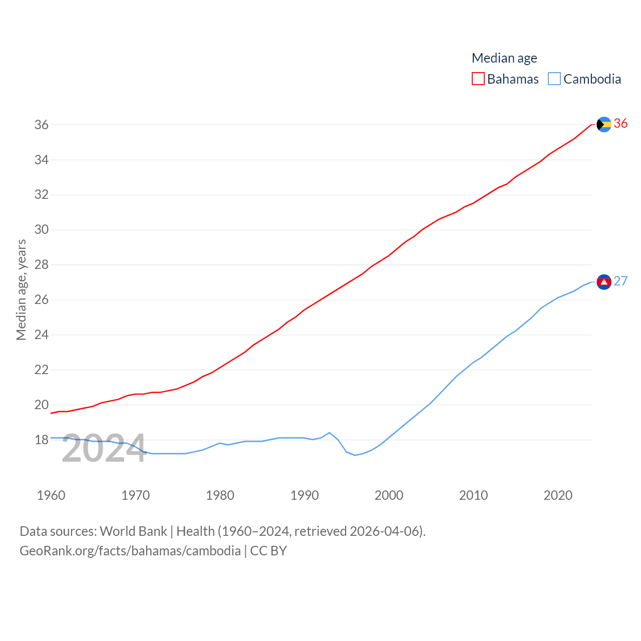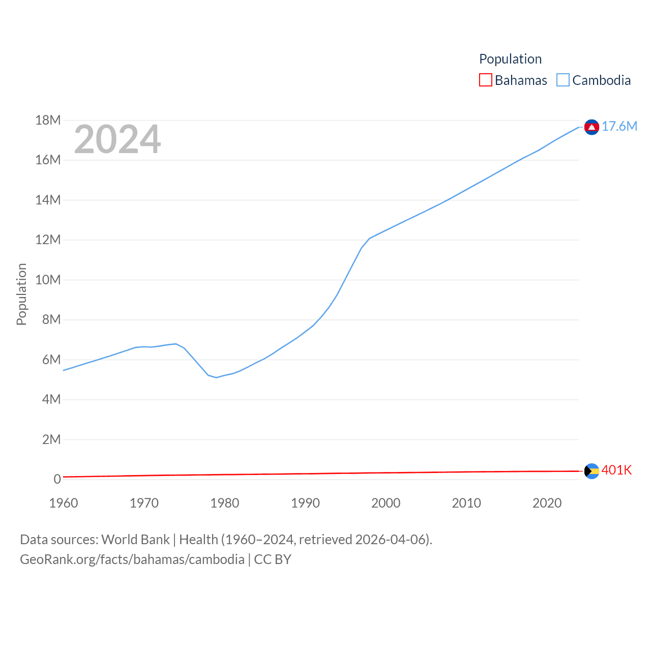 The Bahamas has a population of 401K (ranked 172/197), compared with 17.6M in Cambodia (ranked 73/197). The Bahamas' land area is 3,865 sq mi versus 68,155 sq mi for Cambodia (ranked 162nd vs. 88th).