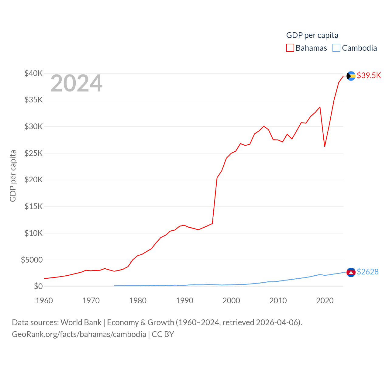 By GDP, The Bahamas ranks 140/197 ($15.8B) and Cambodia ranks 97/197 ($46.4B). By GDP per capita, The Bahamas ranks 30/197 ($39,455), while Cambodia ranks 145/197 ($2,628).