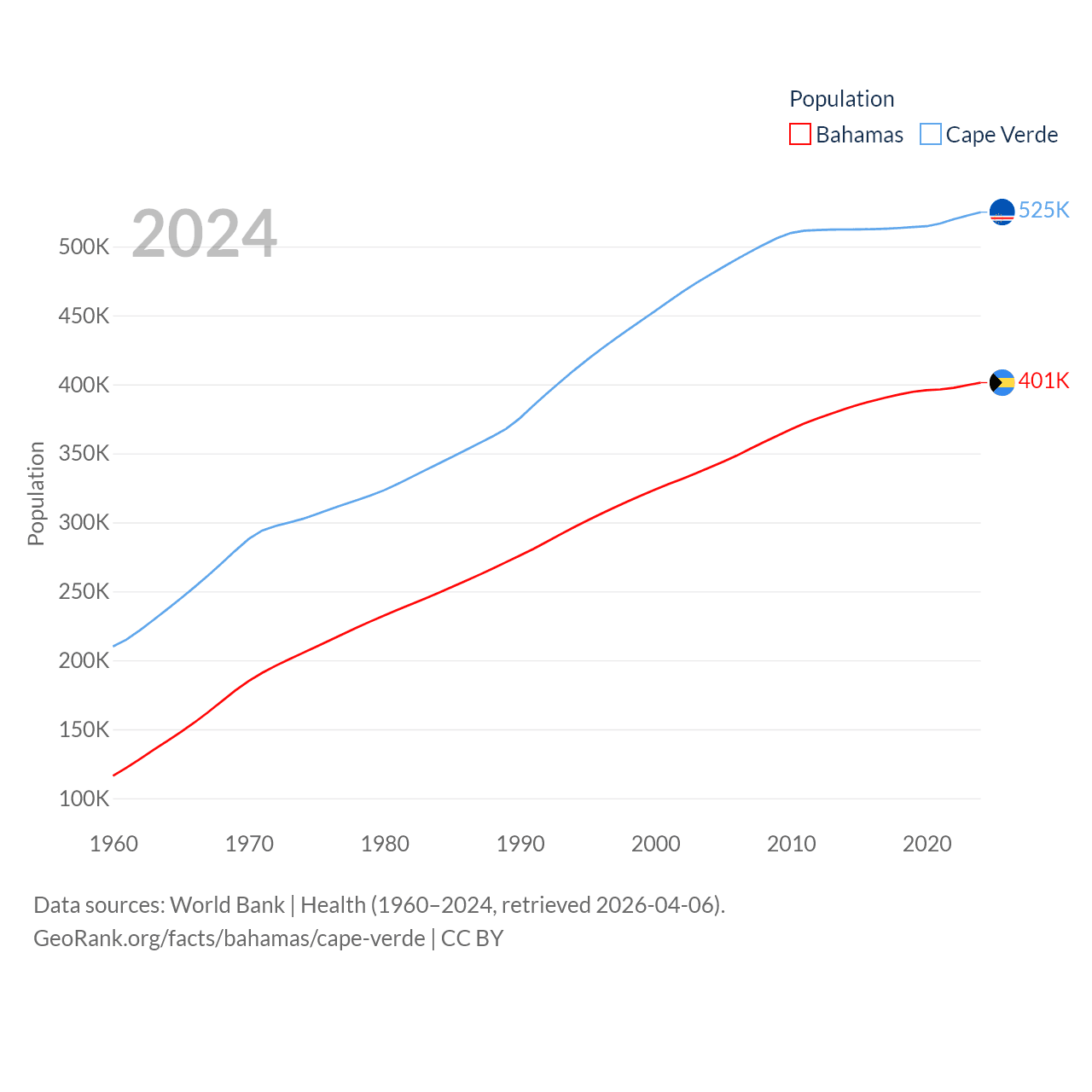 The Bahamas has a population of 401K (ranked 172/197), compared with 525K in Cape Verde (ranked 169/197). The Bahamas' land area is 3,865 sq mi versus 1,556 sq mi for Cape Verde (ranked 162nd vs. 167th).