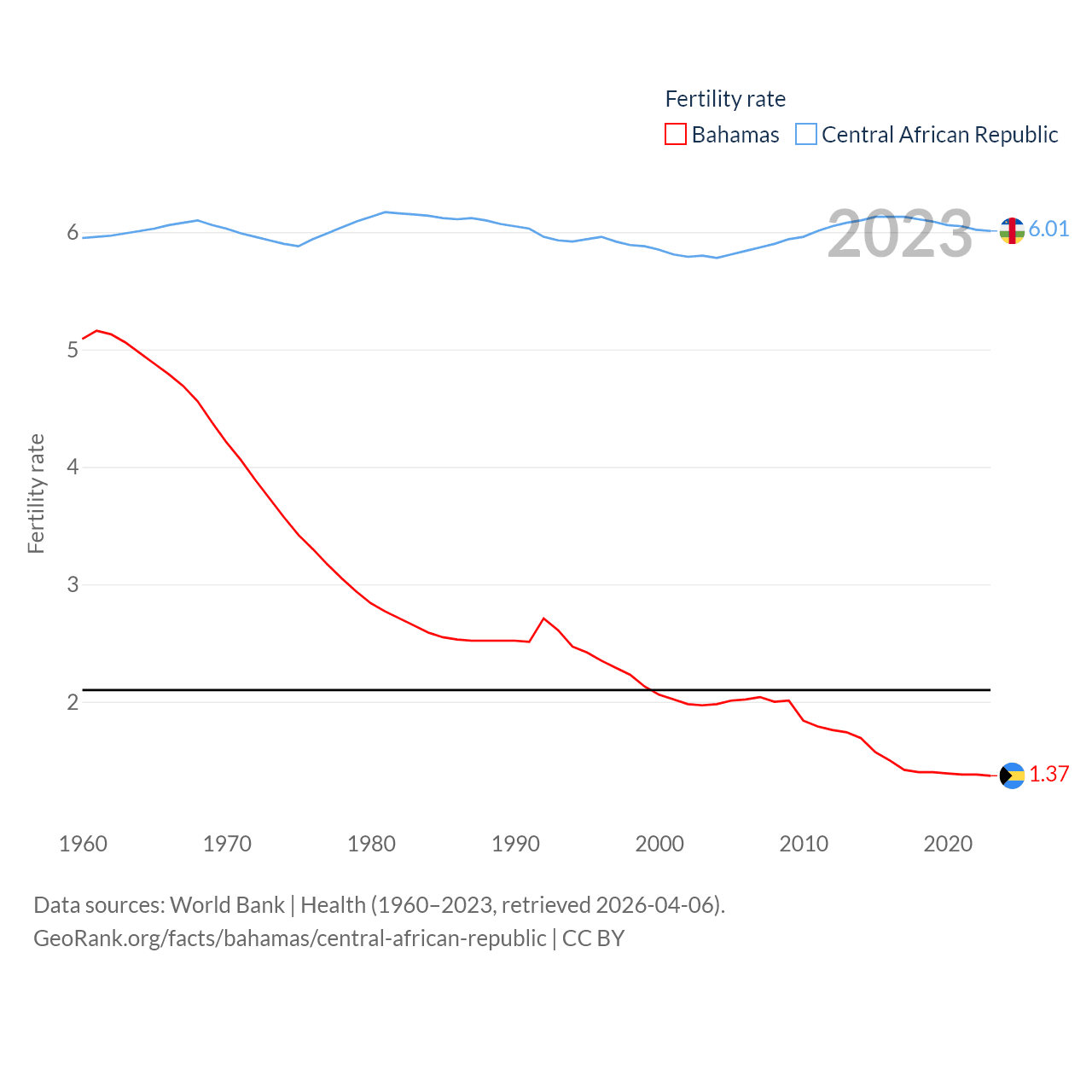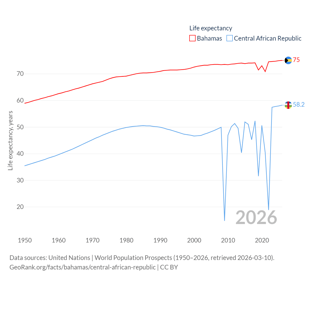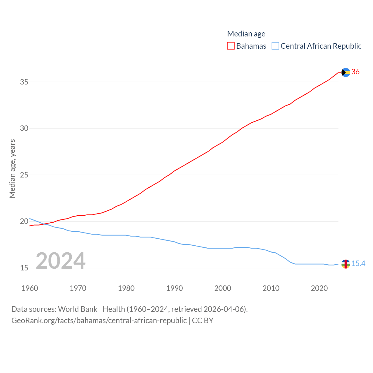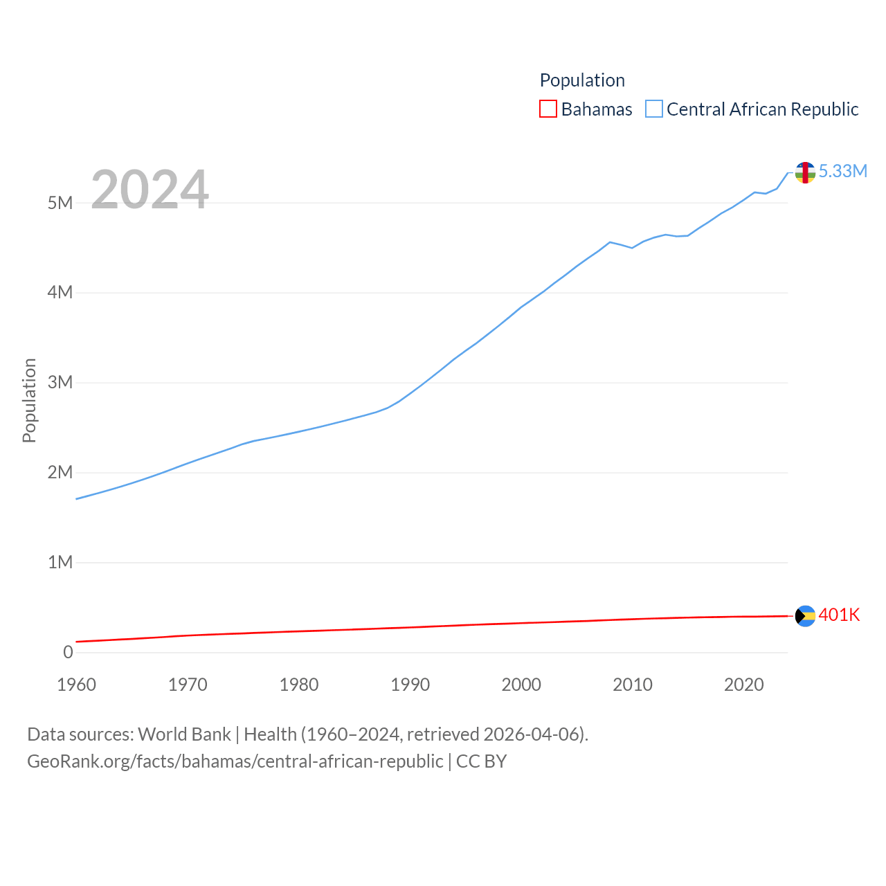 The Bahamas has a population of 401K (ranked 172/197), compared with 5.33M in The Central African Republic (ranked 121/197). The Bahamas' land area is 3,865 sq mi versus 240,534 sq mi for The Central African Republic (ranked 162nd vs. 43rd).