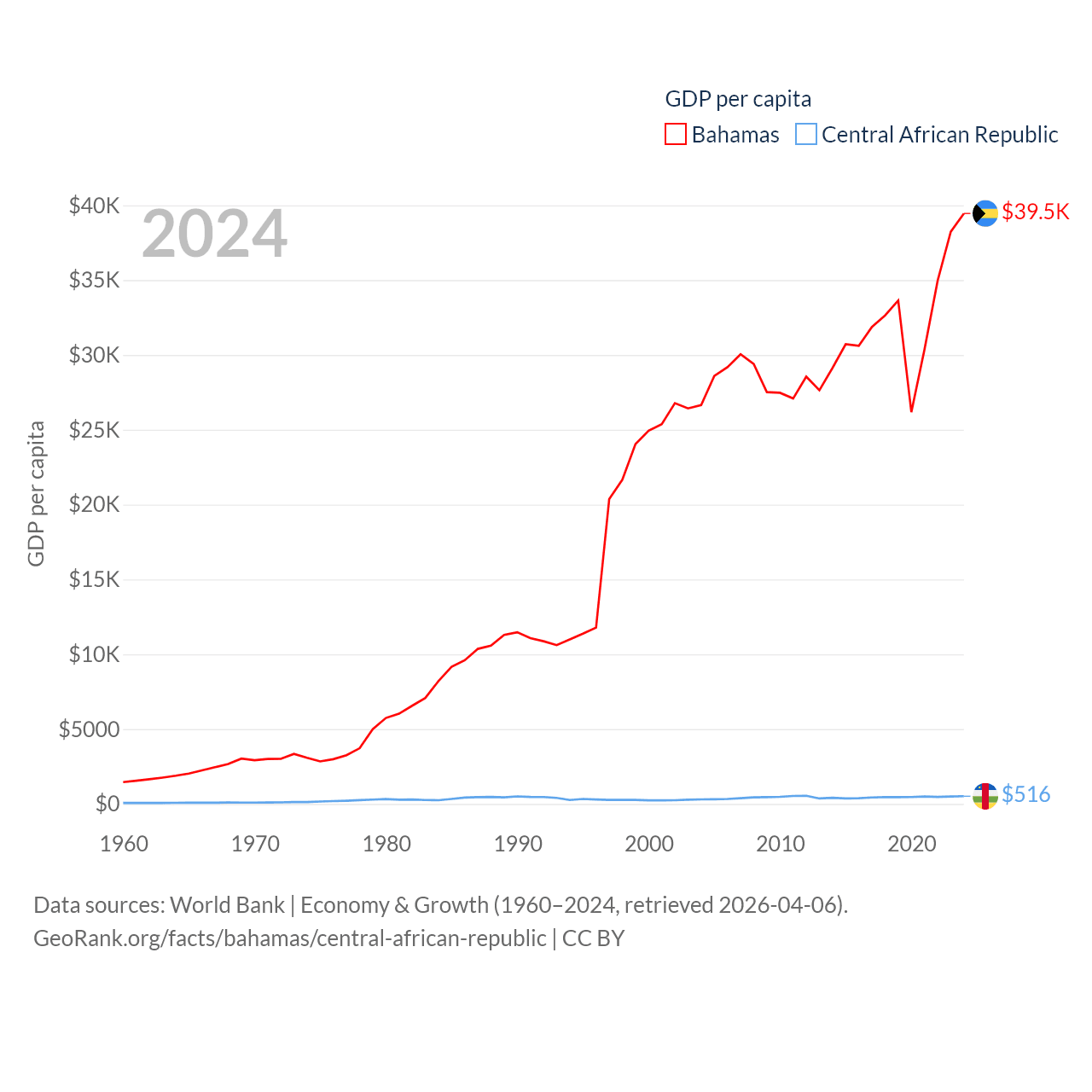 By GDP, The Bahamas ranks 140/197 ($15.8B) and The Central African Republic ranks 171/197 ($2.75B). By GDP per capita, The Bahamas ranks 30/197 ($39,455), while The Central African Republic ranks 195/197 ($516).