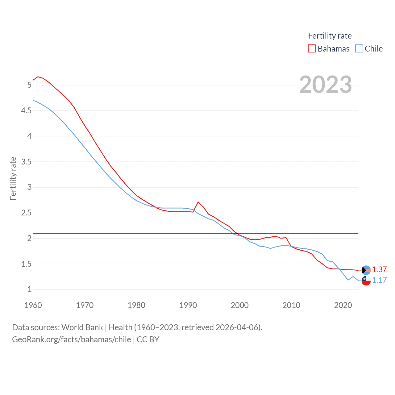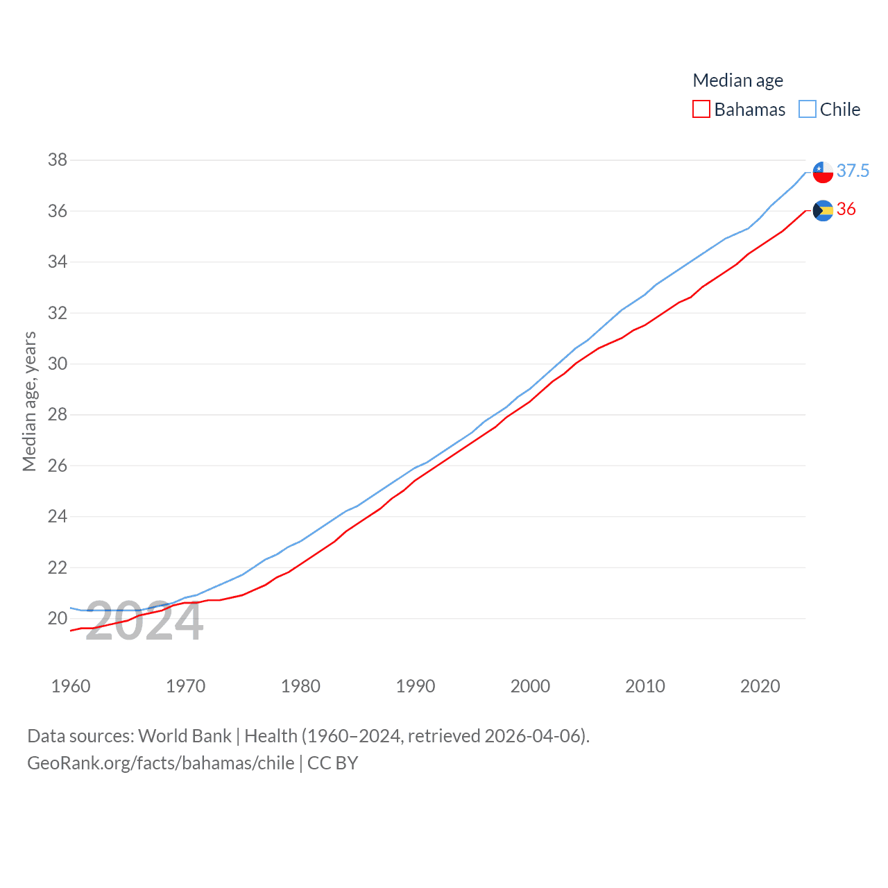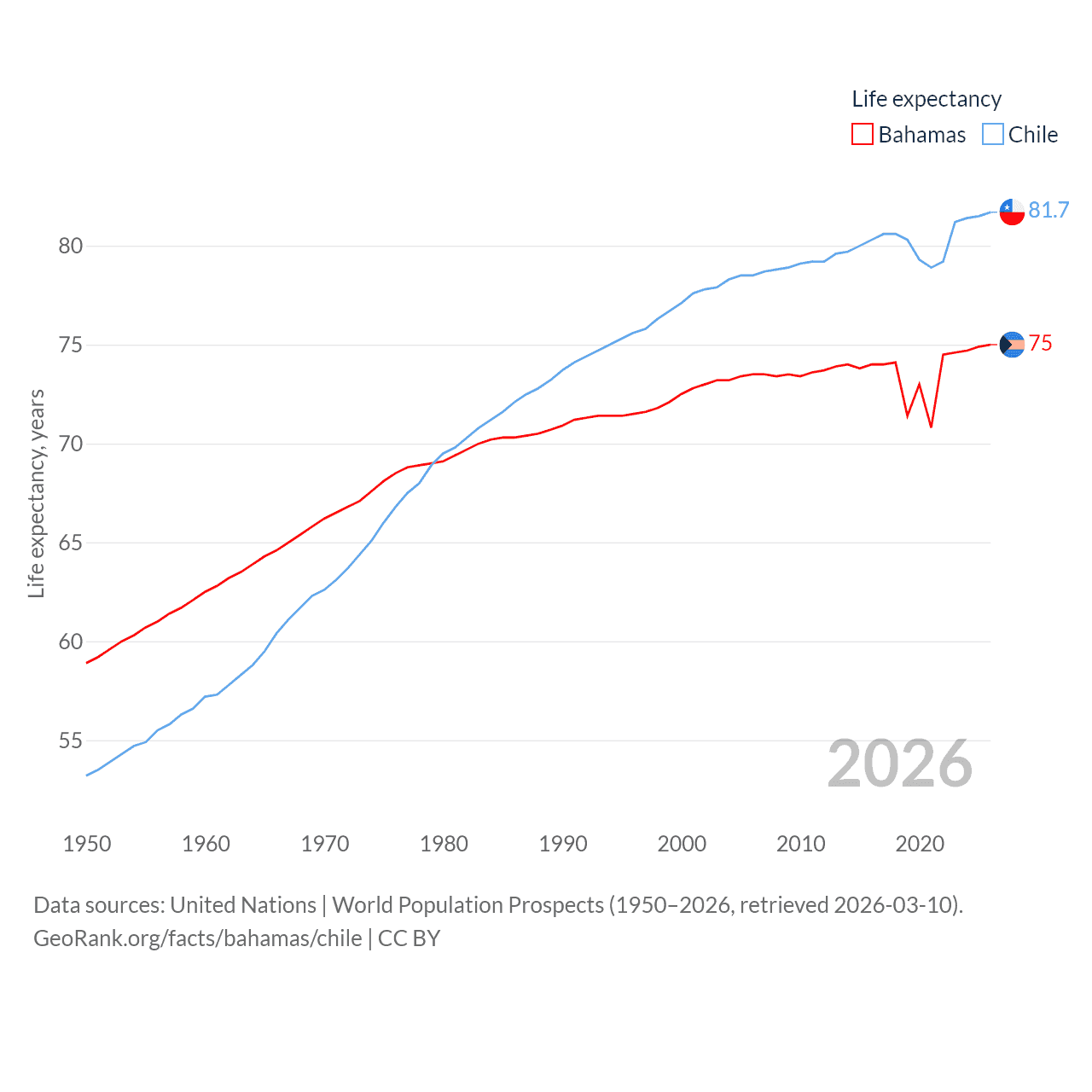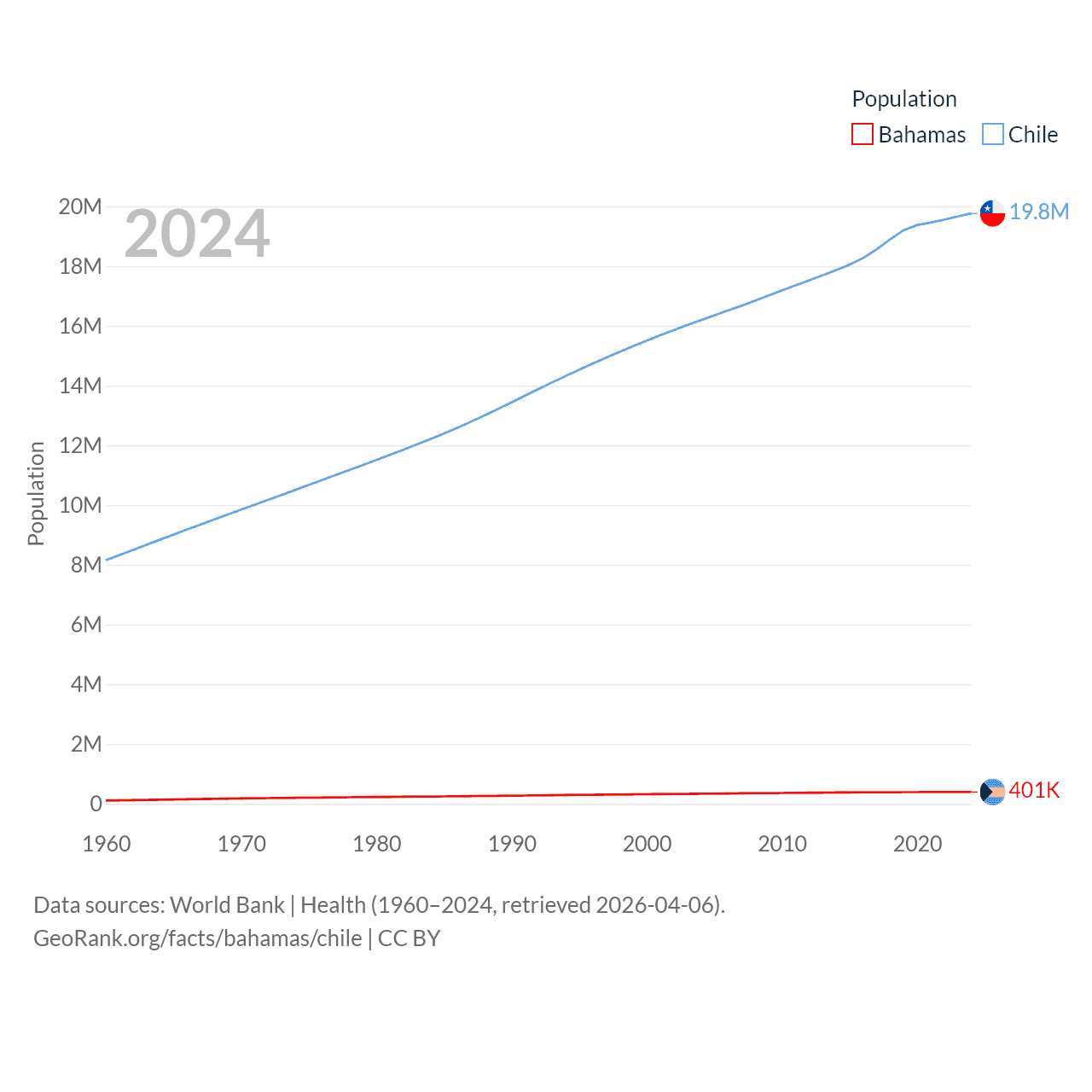 The Bahamas has a population of 401K (ranked 172/197), compared with 19.8M in Chile (ranked 66/197). The Bahamas' land area is 3,865 sq mi versus 286,809 sq mi for Chile (ranked 162nd vs. 38th).
