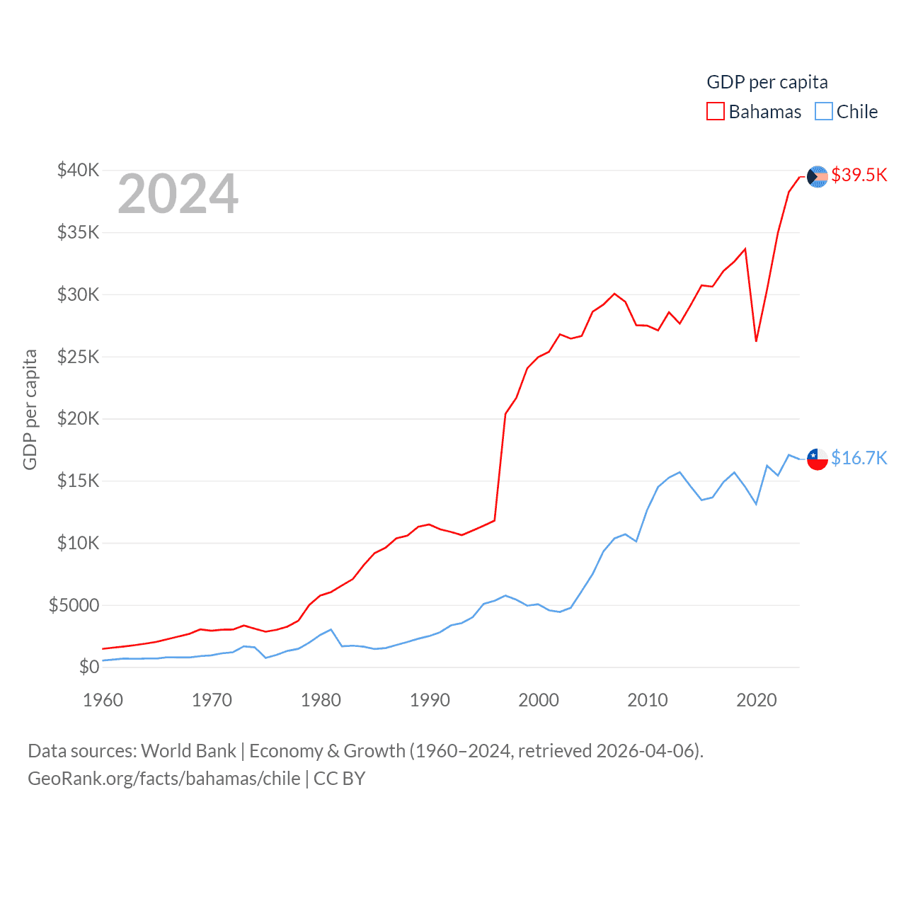 By GDP, The Bahamas ranks 140/197 ($15.8B) and Chile ranks 45/197 ($330B). By GDP per capita, The Bahamas ranks 30/197 ($39,455), while Chile ranks 65/197 ($16,710).