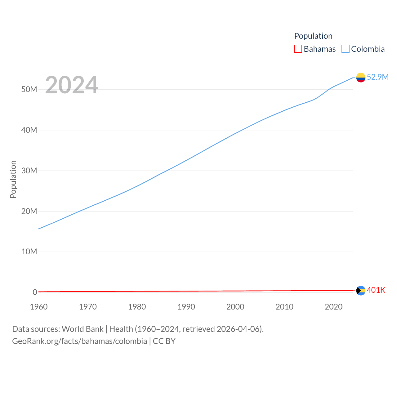 The Bahamas has a population of 401K (ranked 172/197), compared with 52.9M in Colombia (ranked 28/197). The Bahamas' land area is 3,865 sq mi versus 428,380 sq mi for Colombia (ranked 162nd vs. 26th).