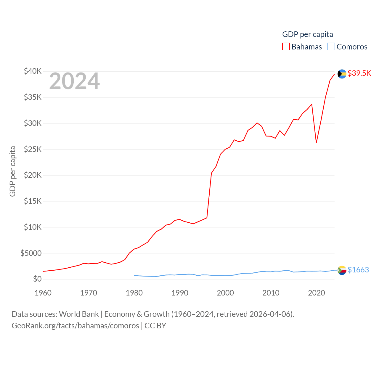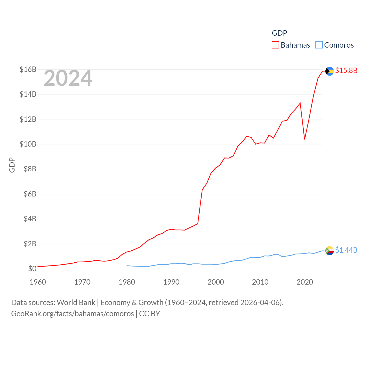 By GDP, The Bahamas ranks 140/197 ($15.8B) and Comoros ranks 183/197 ($1.44B). By GDP per capita, The Bahamas ranks 30/197 ($39,455), while Comoros ranks 161/197 ($1,663).