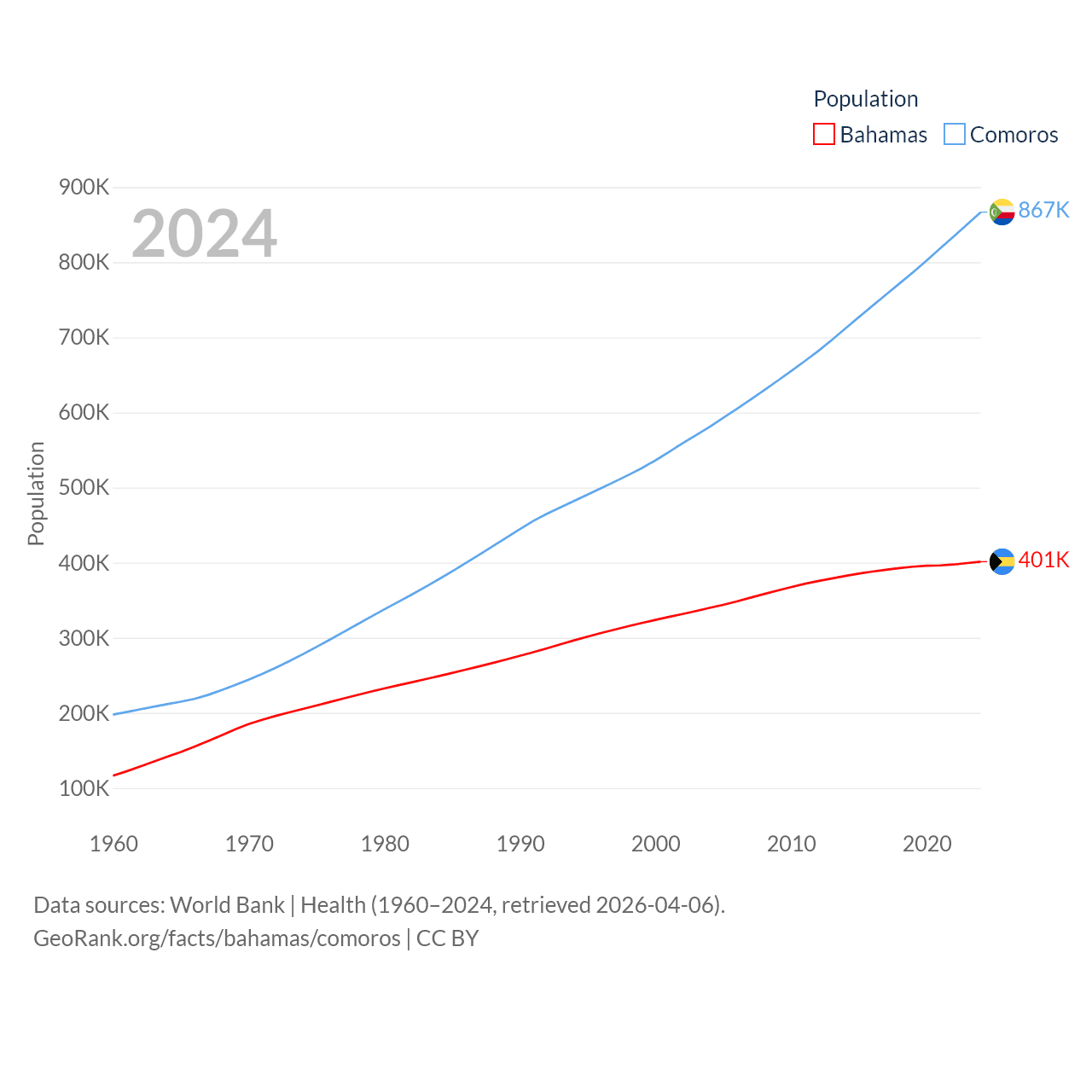 The Bahamas has a population of 401K (ranked 172/197), compared with 867K in Comoros (ranked 160/197). The Bahamas' land area is 3,865 sq mi versus 719 sq mi for Comoros (ranked 162nd vs. 171st).