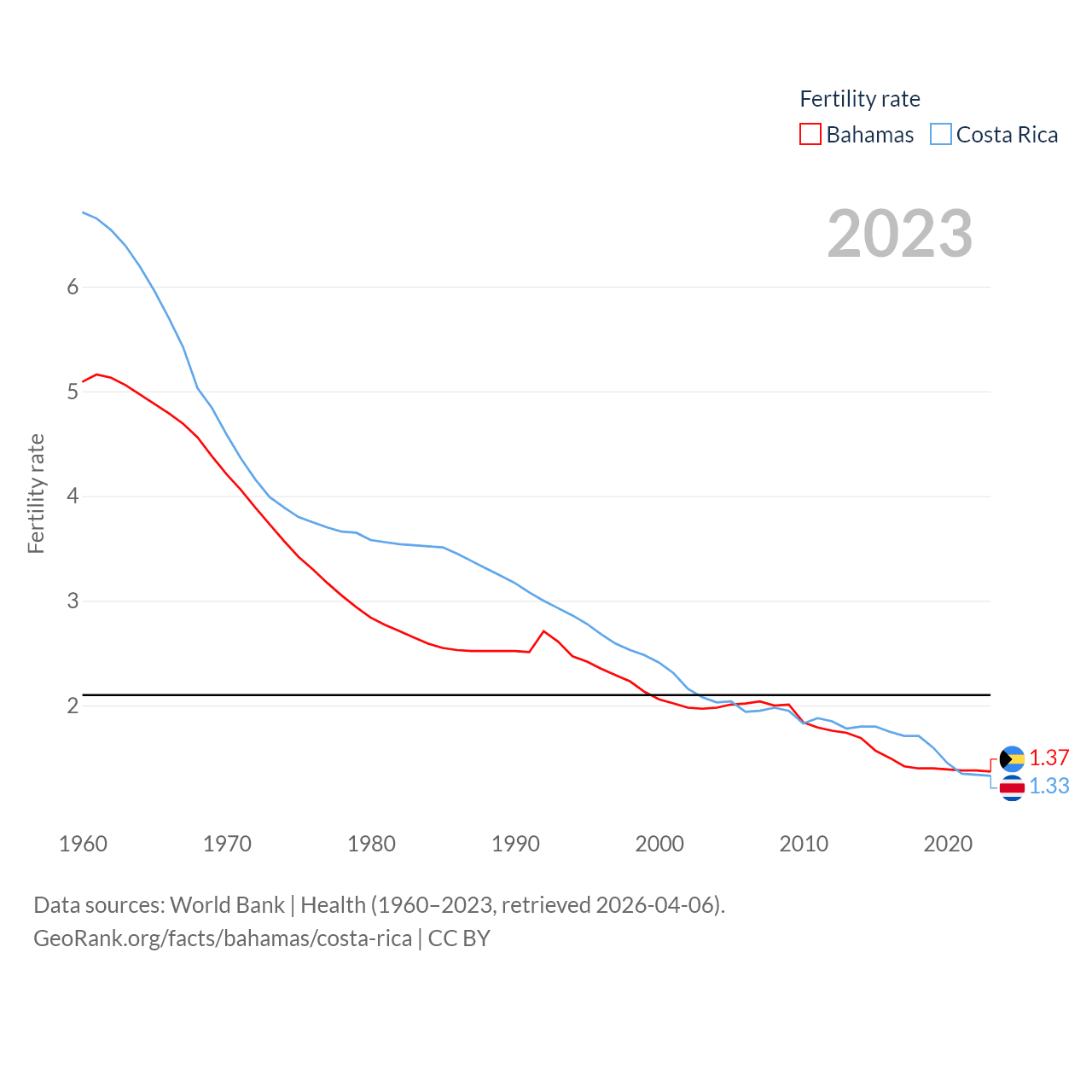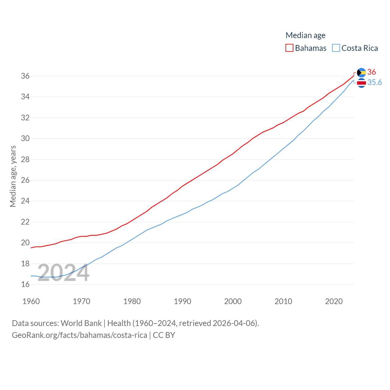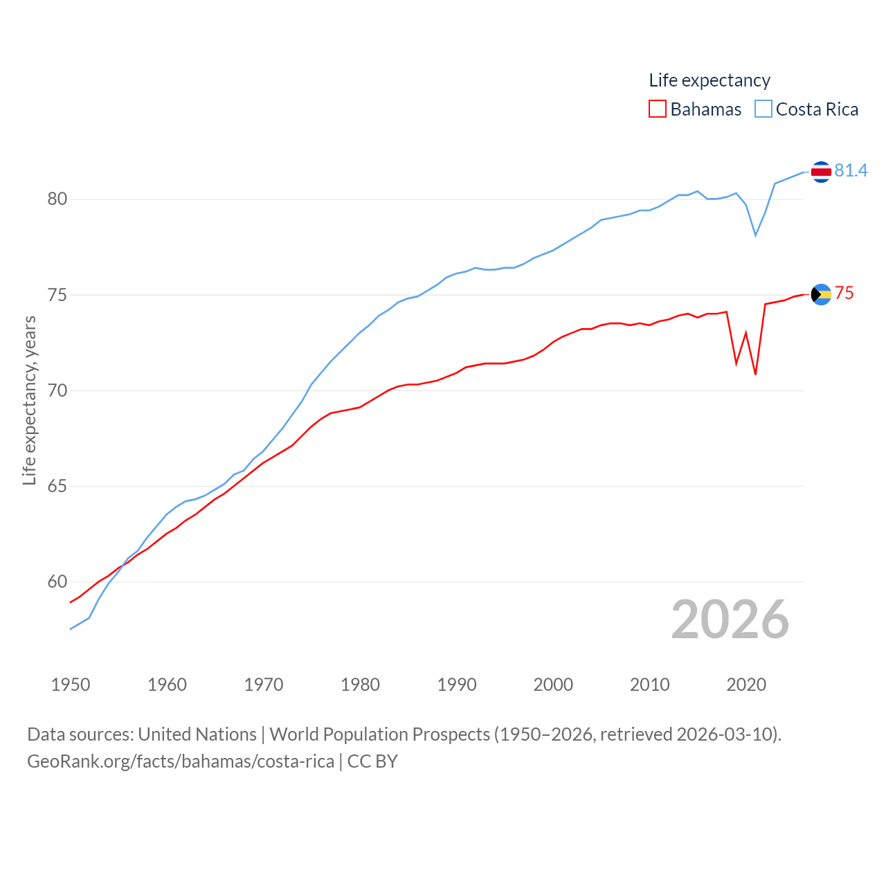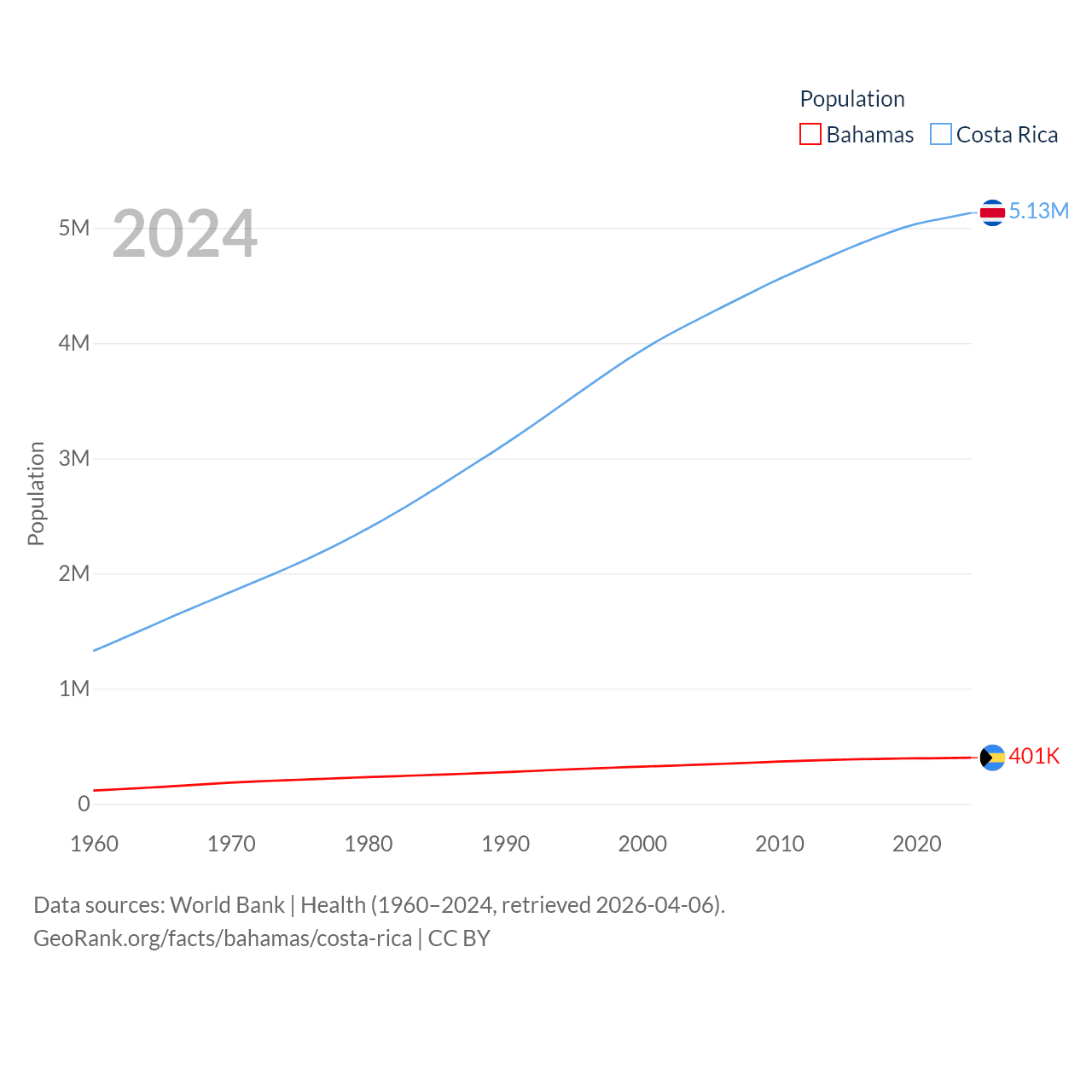 The Bahamas has a population of 401K (ranked 172/197), compared with 5.13M in Costa Rica (ranked 126/197). The Bahamas' land area is 3,865 sq mi versus 19,714 sq mi for Costa Rica (ranked 162nd vs. 126th).