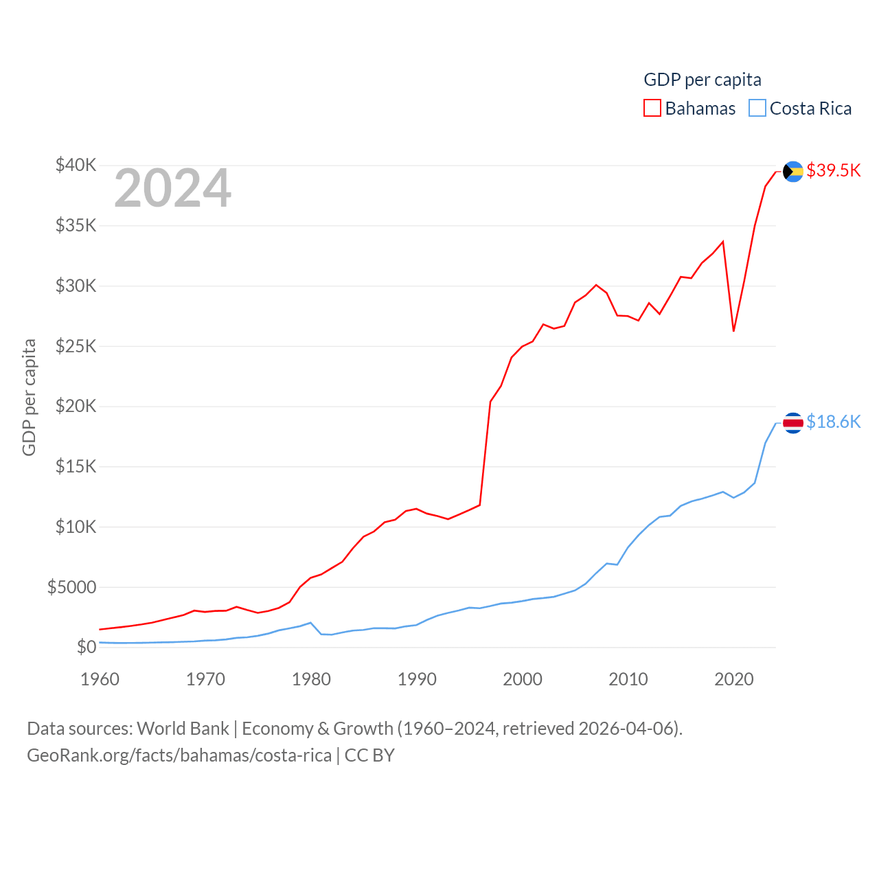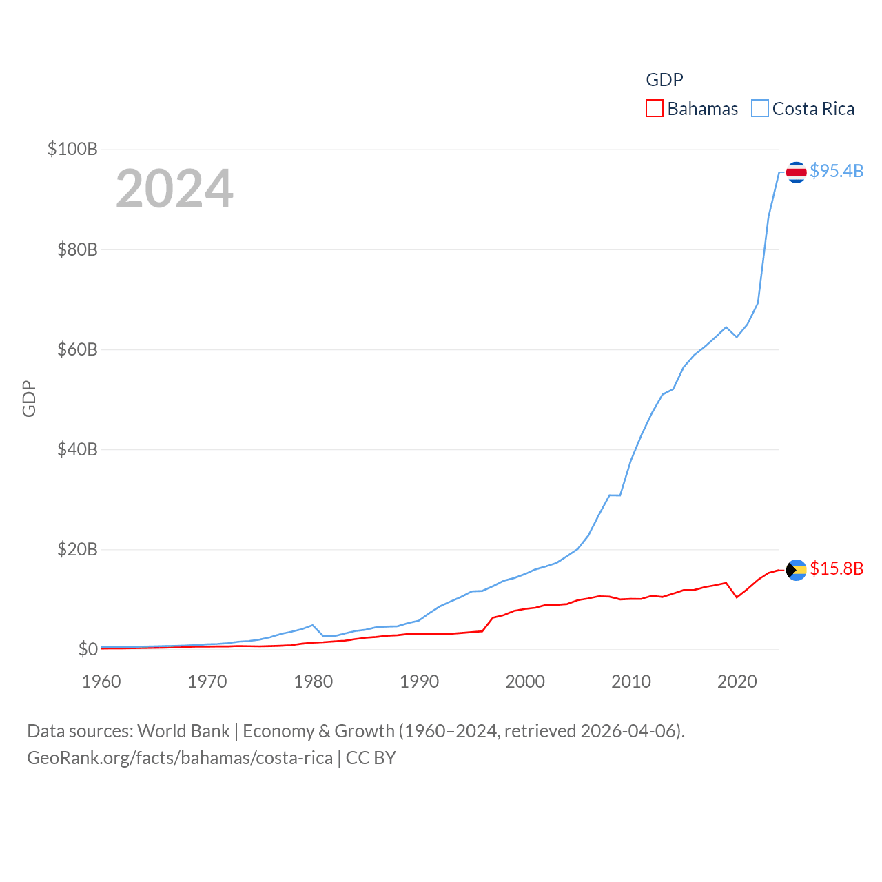 By GDP, The Bahamas ranks 140/197 ($15.8B) and Costa Rica ranks 73/197 ($95.4B). By GDP per capita, The Bahamas ranks 30/197 ($39,455), while Costa Rica ranks 62/197 ($18,587).