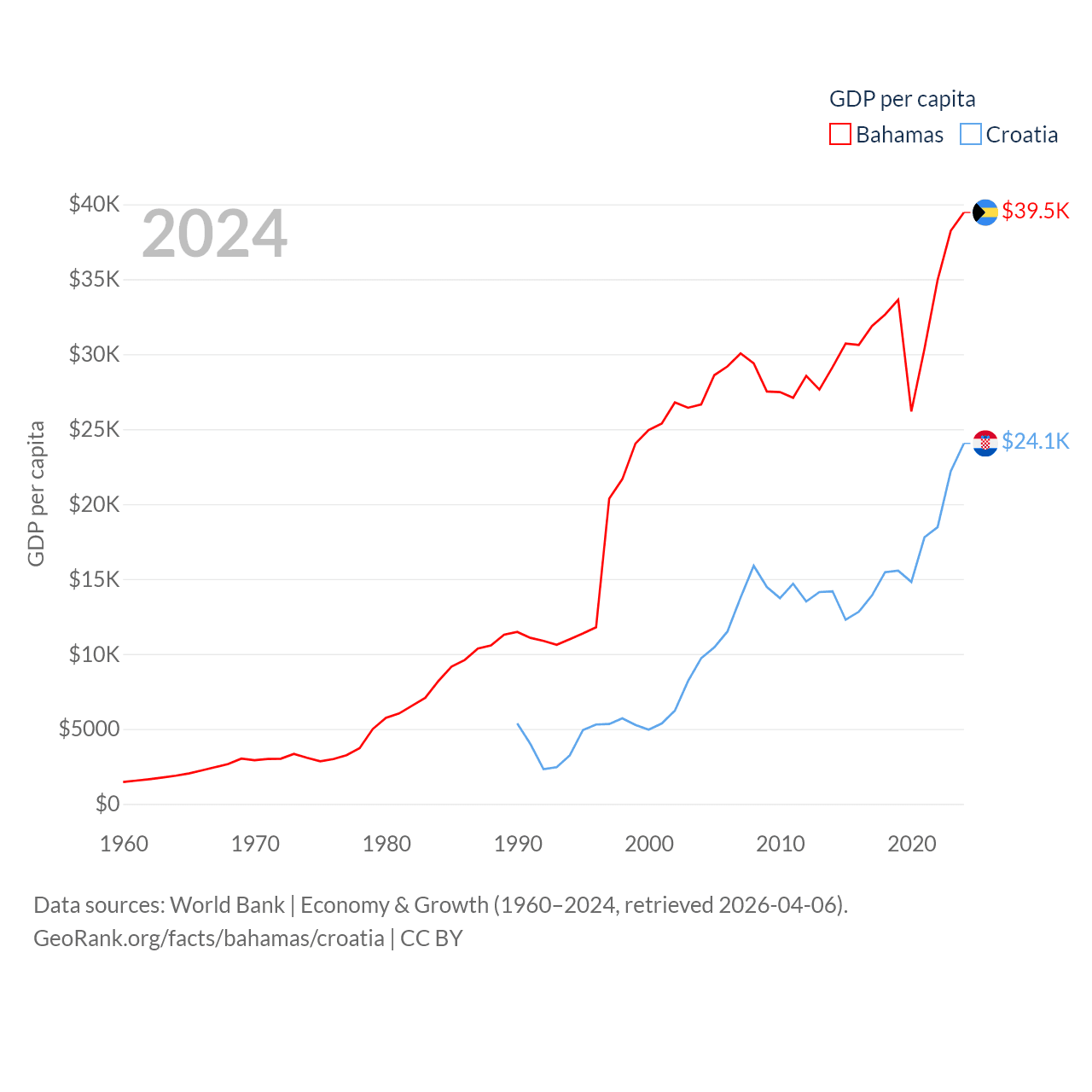 By GDP, The Bahamas ranks 140/197 ($15.8B) and Croatia ranks 75/197 ($93B). By GDP per capita, The Bahamas ranks 30/197 ($39,455), while Croatia ranks 50/197 ($24,050).