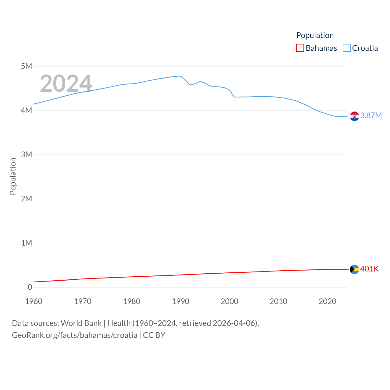 The Bahamas has a population of 401K (ranked 172/197), compared with 3.87M in Croatia (ranked 129/197). The Bahamas' land area is 3,865 sq mi versus 21,606 sq mi for Croatia (ranked 162nd vs. 123rd).