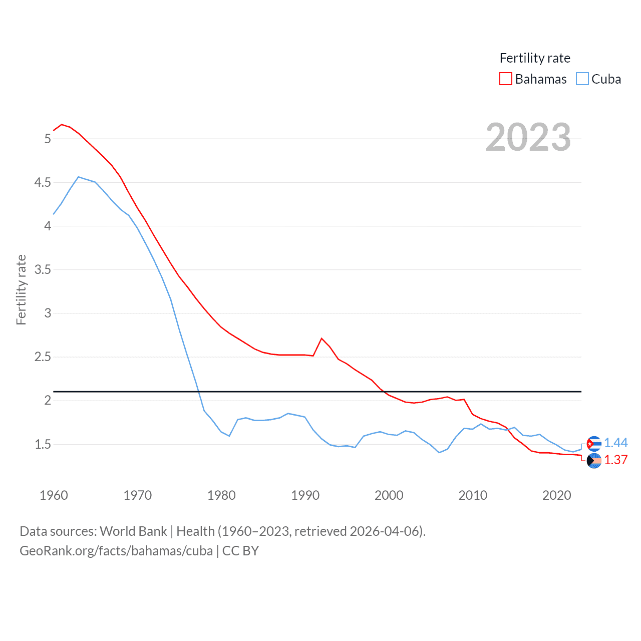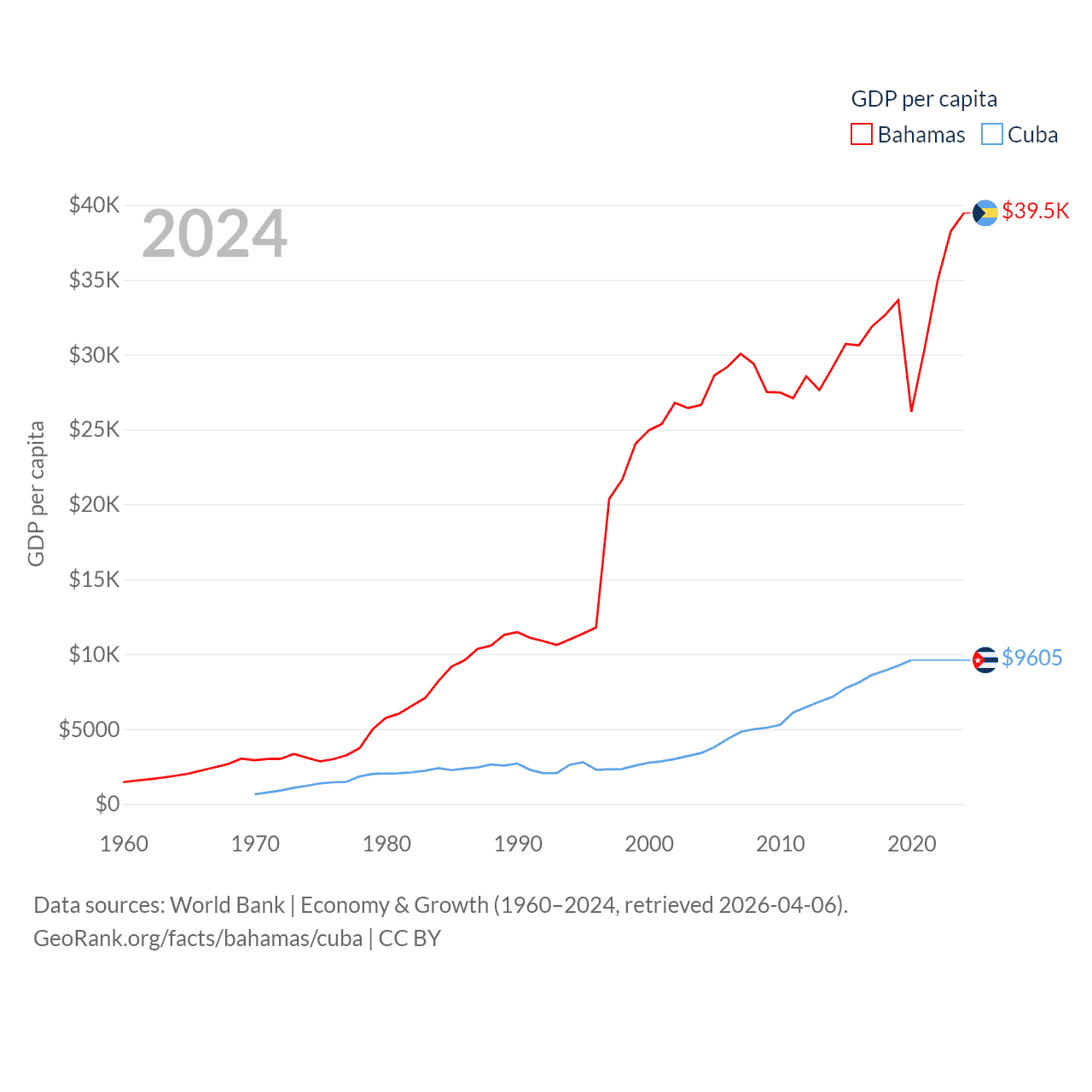 By GDP, The Bahamas ranks 140/197 ($15.8B) and Cuba ranks 69/197 ($107B). By GDP per capita, The Bahamas ranks 30/197 ($39,455), while Cuba ranks 86/197 ($9,605).