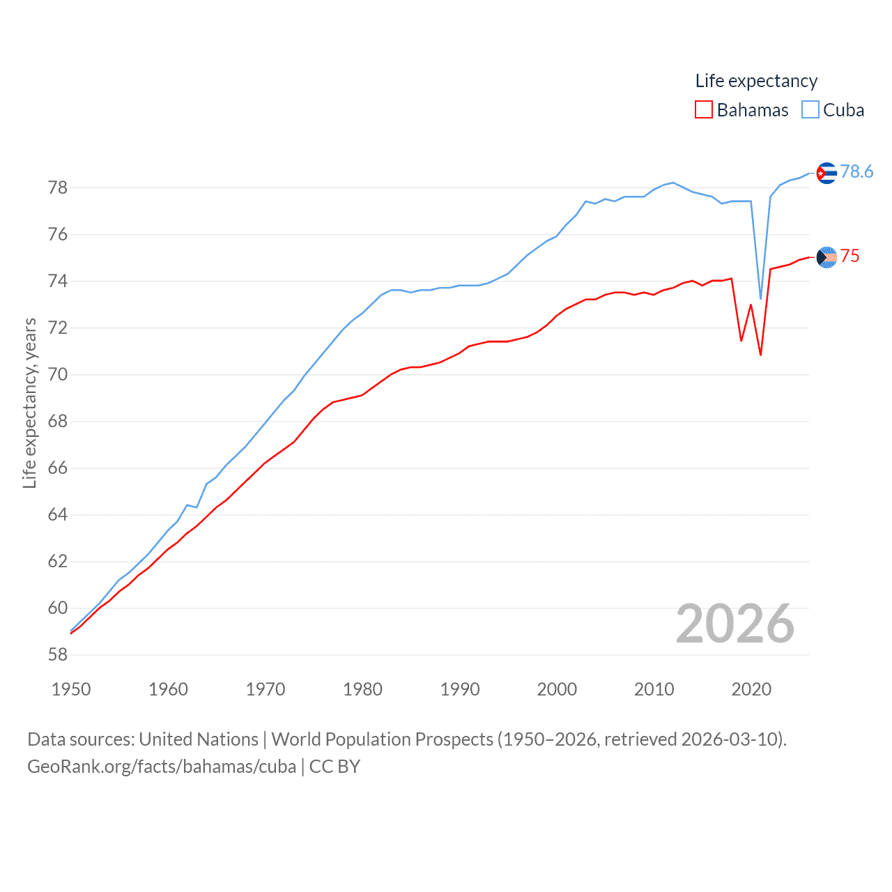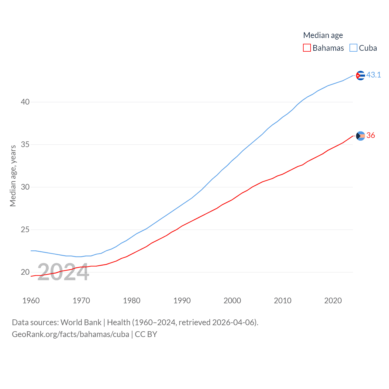 The Bahamas has a population of 401K (ranked 172/197), compared with 11M in Cuba (ranked 87/197). The Bahamas' land area is 3,865 sq mi versus 40,077 sq mi for Cuba (ranked 162nd vs. 103rd).