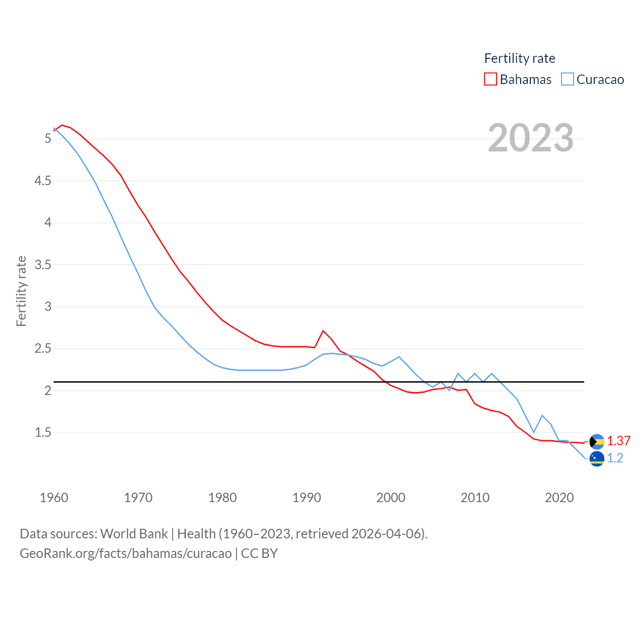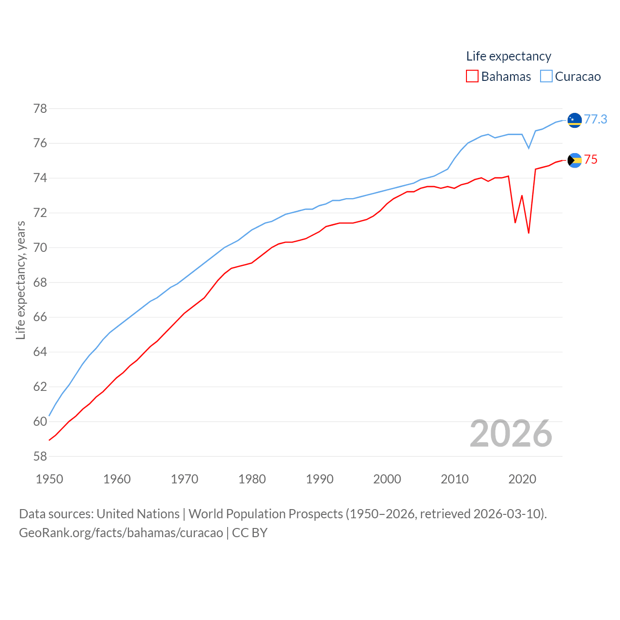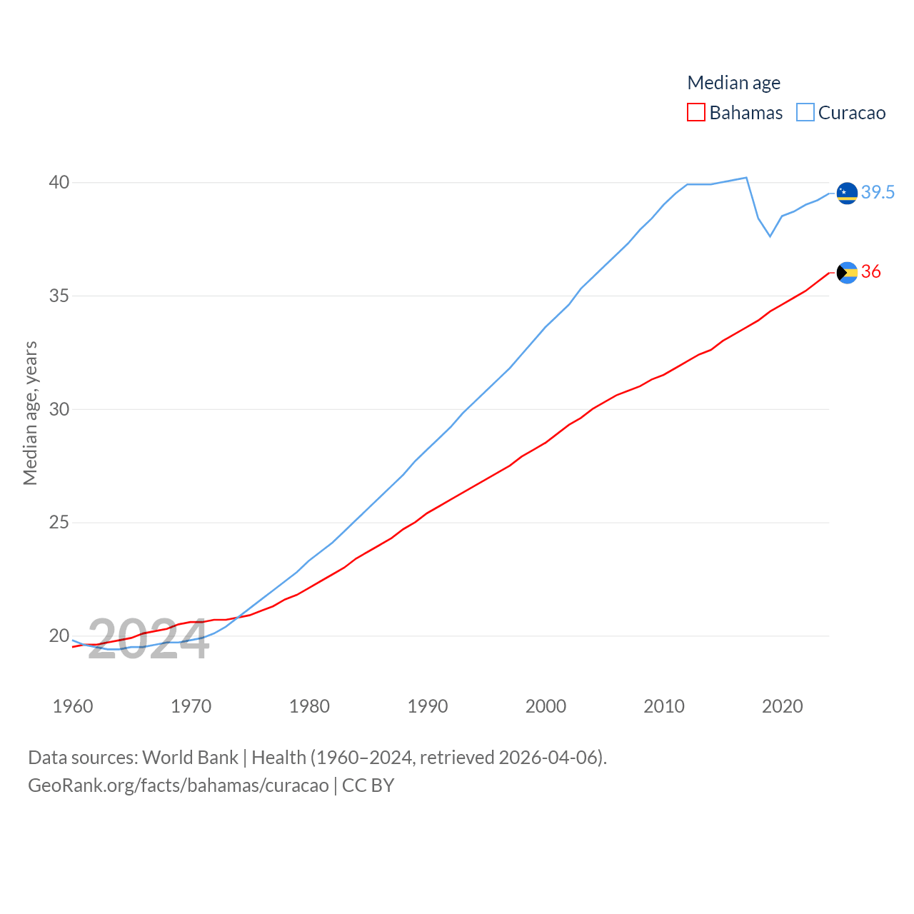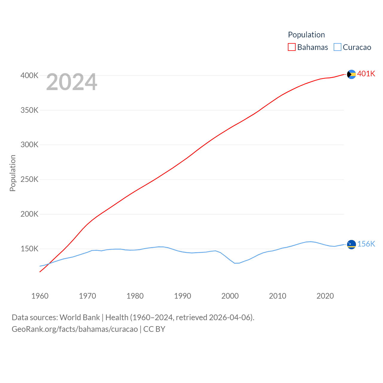 The Bahamas has a population of 401K (ranked 172/197), compared with 156K in Curacao (ranked 179/197). The Bahamas' land area is 3,865 sq mi versus 171.4 sq mi for Curacao (ranked 162nd vs. 182nd).